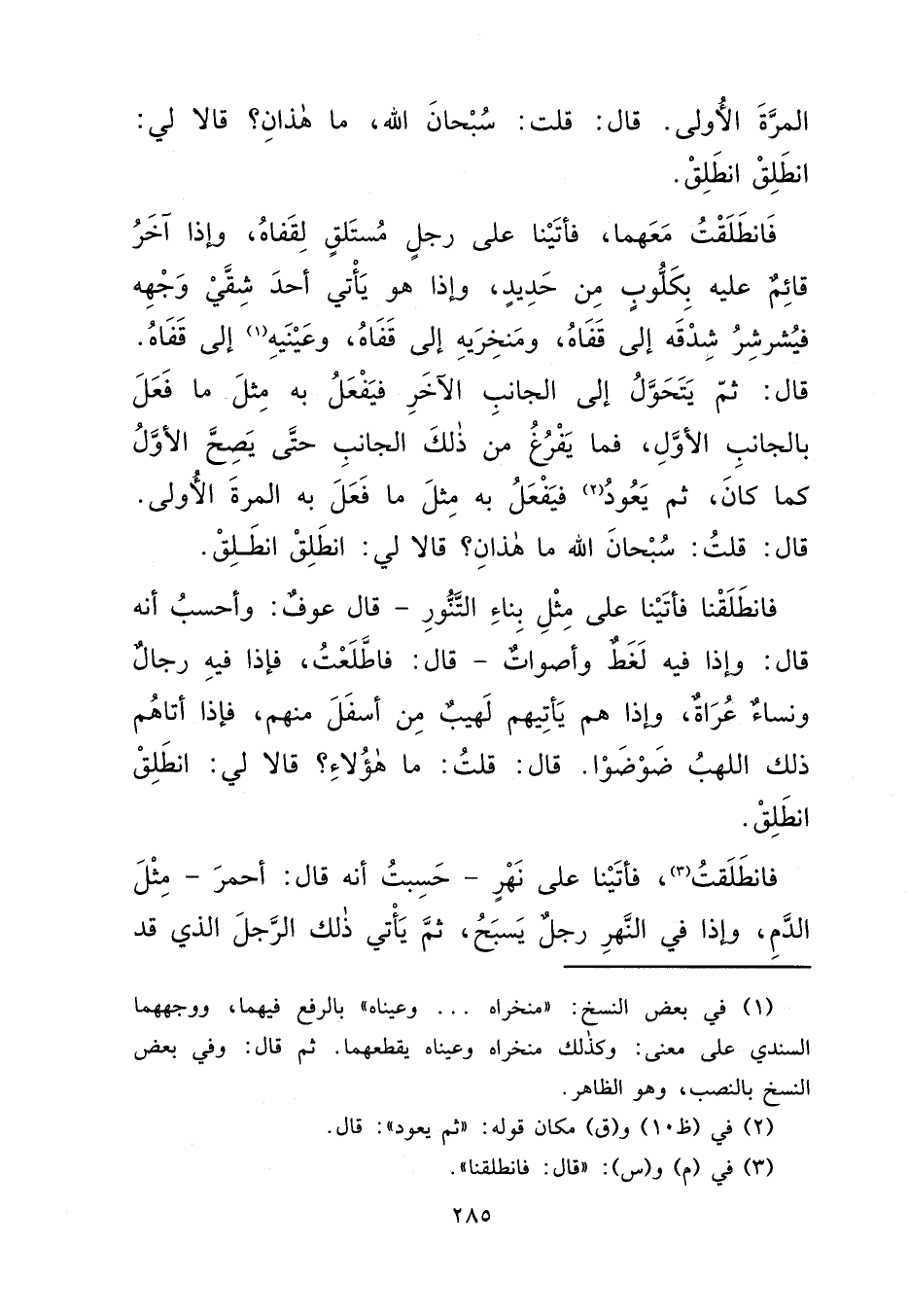 الْمَرَّةَ الْأُولَى "، قَالَ: قُلْتُ: " سُبْحَانَ اللهِ مَا هَذَانِ؟ قَالَا لِي: انْطَلِقْ انْطَلِقْ، فَانْطَلَقْتُ مَعَهُمَا، فَأَتَيْنَا عَلَى رَجُلٍ مُسْتَلْقٍ لِقَفَاهُ، وَإِذَا آخَرُ قَائِمٌ عَلَيْهِ بِكَلُّوبٍ مِنْ حَدِيدٍ، وَإِذَا هُوَ يَأْتِي أَحَدَ شِقَّيْ وَجْهِهِ فَيُشَرْشِرُ شِدْقَهُ إِلَى قَفَاهُ، وَمَنْخِرَيْهِ إِلَى قَفَاهُ، وَعَيْنَيْهِ (١) إِلَى قَفَاهُ "، قَالَ: " ثُمَّ يَتَحَوَّلُ إِلَى الْجَانِبِ الْآخَرِ، فَيَفْعَلُ بِهِ مِثْلَ مَا فَعَلَ بِالْجَانِبِ الْأَوَّلِ، فَمَا يَفْرُغُ مِنْ ذَلِكَ الْجَانِبِ حَتَّى يَصِحَّ الْأَوَّلُ كَمَا كَانَ، ثُمَّ يَعُودُ (٢) فَيَفْعَلُ بِهِ مِثْلَ مَا فَعَلَ بِهِ الْمَرَّةَ الْأُولَى "، قَالَ: قُلْتُ: " سُبْحَانَ اللهِ مَا هَذَانِ؟ قَالَا لِي: انْطَلِقْ انْطَلِقْ "، قَالَ: " فَانْطَلَقْنَا، فَأَتَيْنَا عَلَى مِثْلِ بِنَاءِ التَّنُّورِ "، قَالَ عَوْفٌ: وَأَحْسَبُ أَنَّهُ قَالَ: وَإِذَا فِيهِ لَغَطٌ وَأَصْوَاتٌ، قَالَ: " فَاطَّلَعْتُ، فَإِذَا فِيهِ رِجَالٌ وَنِسَاءٌ عُرَاةٌ، وَإِذَا هُمْ يَأْتِيهِمْ لَهِيبٌ مِنْ أَسْفَلَ مِنْهُمْ، فَإِذَا أَتَاهُمْ ذَلِكَ اللهَبُ ضَوْضَوْا "، قَالَ: قُلْتُ: " مَا هَؤُلَاءِ؟ قَالَا لِي: انْطَلِقْ انْطَلِقْ، فَانْطَلَقْتُ (٣) فَأَتَيْنَا عَلَى نَهَرٍ، حَسِبْتُ أَنَّهُ قَالَ: أَحْمَرَ، مِثْلِ الدَّمِ، وَإِذَا فِي النَّهَرِ رَجُلٌ يَسْبَحُ، ثُمَّ يَأْتِي ذَلِكَ الرَّجُلُ الَّذِي قَدْ