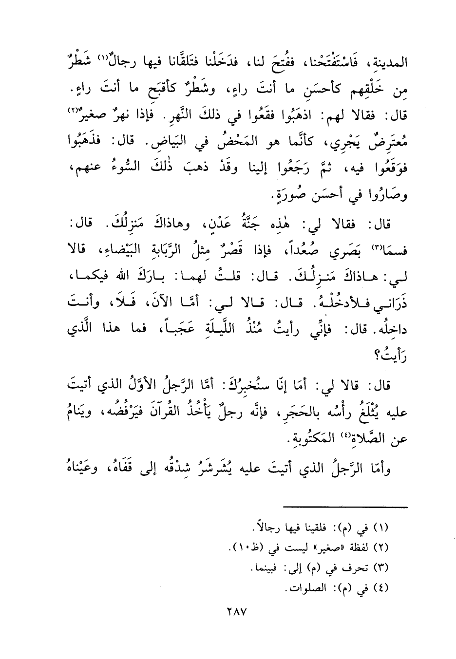 الْمَدِينَةِ، فَاسْتَفْتَحْنَا، فَفُتِحَ لَنَا، فَدَخَلْنَا فَتَلَقَّانَا فِيهَا رِجَالٌ (١) شَطْرٌ مِنْ خَلْقِهِمْ كَأَحْسَنِ مَا أَنْتَ رَاءٍ، وَشَطْرٌ كَأَقْبَحِ مَا أَنْتَ رَاءٍ "، قَالَ: " فَقَالَا لَهُمْ: اذْهَبُوا فَقَعُوا فِي ذَلِكَ النَّهَرِ، فَإِذَا نَهَرٌ صَغِيرٌ (٢) مُعْتَرِضٌ يَجْرِي كَأَنَّمَا هُوَ الْمَحْضُ فِي الْبَيَاضِ "، قَالَ: " فَذَهَبُوا فَوَقَعُوا فِيهِ، ثُمَّ رَجَعُوا إِلَيْنَا، وَقَدْ ذَهَبَ ذَلِكَ السُّوءُ عَنْهُمْ، وَصَارُوا فِي أَحْسَنِ صُورَةٍ "، قَالَ: " فَقَالَا لِي: هَذِهِ جَنَّةُ عَدْنٍ، وَهَاذَاكَ مَنْزِلُكَ "، قَالَ: " فَسَمَا (٣) بَصَرِي صُعُدًا، فَإِذَا قَصْرٌ مِثْلُ الرَّبَابَةِ الْبَيْضَاءِ "، قَالَا لِي: " هَاذَاكَ مَنْزِلُكَ "، قَالَ: " قُلْتُ لَهُمَا: بَارَكَ اللهُ فِيكُمَا، ذَرَانِي فَلَأَدْخُلُهُ "، قَالَ: " قَالَا لِي: أَمَّا الْآنَ فَلَا، وَأَنْتَ دَاخِلُهُ "، قَالَ: " فَإِنِّي رَأَيْتُ مُنْذُ اللَّيْلَةِ عَجَبًا فَمَا هَذَا الَّذِي رَأَيْتُ؟ " قَالَ: " قَالَا لِي: " أَمَا إِنَّا سَنُخْبِرُكَ: أَمَّا الرَّجُلُ الْأَوَّلُ الَّذِي أَتَيْتَ عَلَيْهِ يُثْلَغُ رَأْسُهُ بِالْحَجَرِ، فَإِنَّهُ رَجُلٌ يَأْخُذُ الْقُرْآنَ فَيَرْفُضُهُ، وَيَنَامُ عَنِ الصَّلَاةِ (٤) الْمَكْتُوبَةِ، وَأَمَّا الرَّجُلُ الَّذِي أَتَيْتَ عَلَيْهِ يُشَرْشَرُ شِدْقُهُ إِلَى قَفَاهُ، وَعَيْنَاهُ