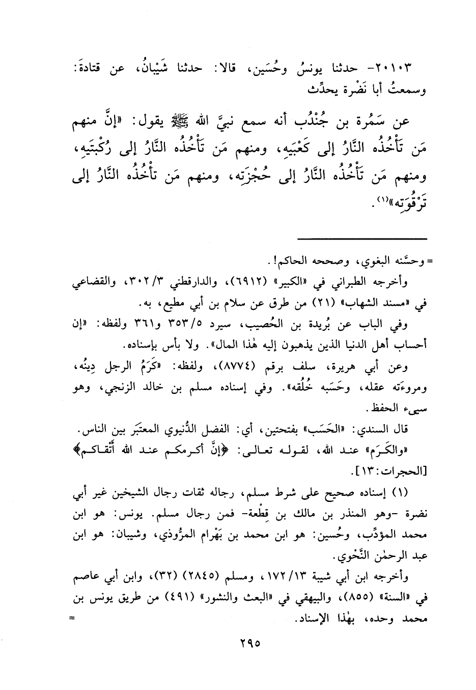 ٢٠١٠٣ - حَدَّثَنَا يُونُسُ، وَحُسَيْنٌ، قَالَا: حَدَّثَنَا شَيْبَانُ، عَنْ قَتَادَةَ، وَسَمِعْتُ أَبَا نَضْرَةَ، يُحَدِّثُ عَنْ سَمُرَةَ بْنِ جُنْدُبٍ، أَنَّهُ سَمِعَ نَبِيَّ اللهِ صَلَّى اللهُ عَلَيْهِ وَسَلَّمَ يَقُولُ: " إِنَّ مِنْهُمْ مَنْ تَأْخُذُهُ النَّارُ إِلَى كَعْبَيْهِ، وَمِنْهُمْ مَنْ تَأْخُذُهُ النَّارُ إِلَى رُكْبَتَيْهِ، وَمِنْهُمْ مَنْ تَأْخُذُهُ النَّارُ إِلَى حُجْزَتِهِ، وَمِنْهُمْ مَنْ تَأْخُذُهُ النَّارُ إِلَى تَرْقُوَتِهِ " (١)