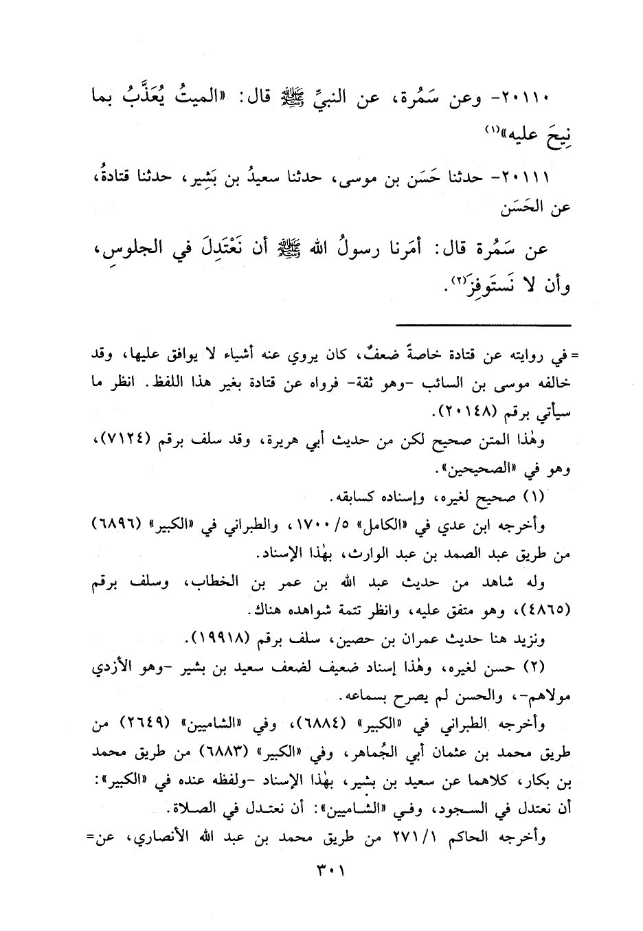 ٢٠١١١ - حَدَّثَنَا حَسَنُ بْنُ مُوسَى، حَدَّثَنَا سَعِيدُ بْنُ بَشِيرٍ، حَدَّثَنَا قَتَادَةُ، عَنِ الْحَسَنِ، عَنْ سَمُرَةَ، قَالَ: " أَمَرَنَا رَسُولُ اللهِ صَلَّى اللهُ عَلَيْهِ وَسَلَّمَ أَنْ نَعْتَدِلَ فِي الْجُلُوسِ، وَأَنْ لَا نَسْتَوْفِزَ " (٢)