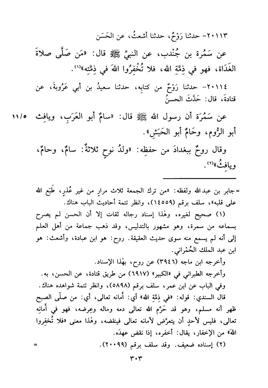 ٢٠١١٣ - حَدَّثَنَا رَوْحٌ، حَدَّثَنَا أَشْعَثُ، عَنِ الْحَسَنِ، عَنْ سَمُرَّةَ بْنِ جُنْدُبٍ، عَنِ النَّبِيِّ صَلَّى اللهُ عَلَيْهِ وَسَلَّمَ قَالَ: " مَنْ صَلَّى صَلَاةَ الْغَدَاةِ فَهُوَ فِي ذِمَّةِ اللهِ، فَلَا تُخْفِرُوا اللهَ فِي ذِمَّتِهِ " (١)