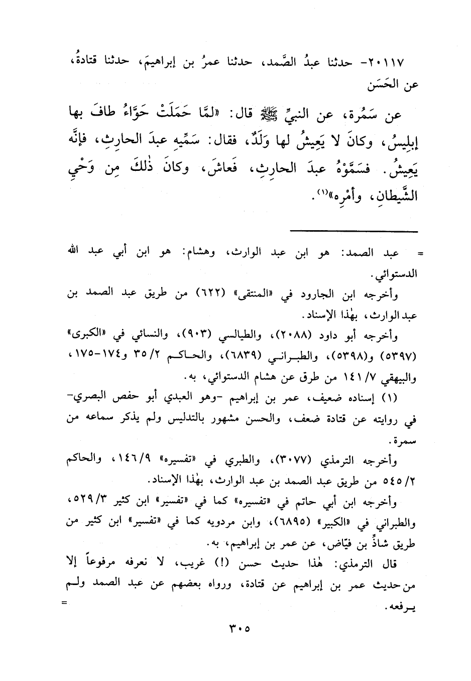 ٢٠١١٧ - حَدَّثَنَا عَبْدُ الصَّمَدِ، حَدَّثَنَا عُمَرُ بْنُ إِبْرَاهِيمَ، حَدَّثَنَا قَتَادَةُ، عَنِ الْحَسَنِ، عَنْ سَمُرَةَ، عَنِ النَّبِيِّ صَلَّى اللهُ عَلَيْهِ وَسَلَّمَ قَالَ: " لَمَّا حَمَلَتْ حَوَّاءُ طَافَ بِهَا إِبْلِيسُ، وَكَانَ لَا يَعِيشُ لَهَا وَلَدٌ، فَقَالَ: " سَمِّيهِ عَبْدَ الْحَارِثِ، فَإِنَّهُ يَعِيشُ، فَسَمَّوْهُ عَبْدَ الْحَارِثِ، فَعَاشَ، وَكَانَ ذَلِكَ مِنْ وَحْيِ الشَّيْطَانِ، وَأَمْرِهِ (١)