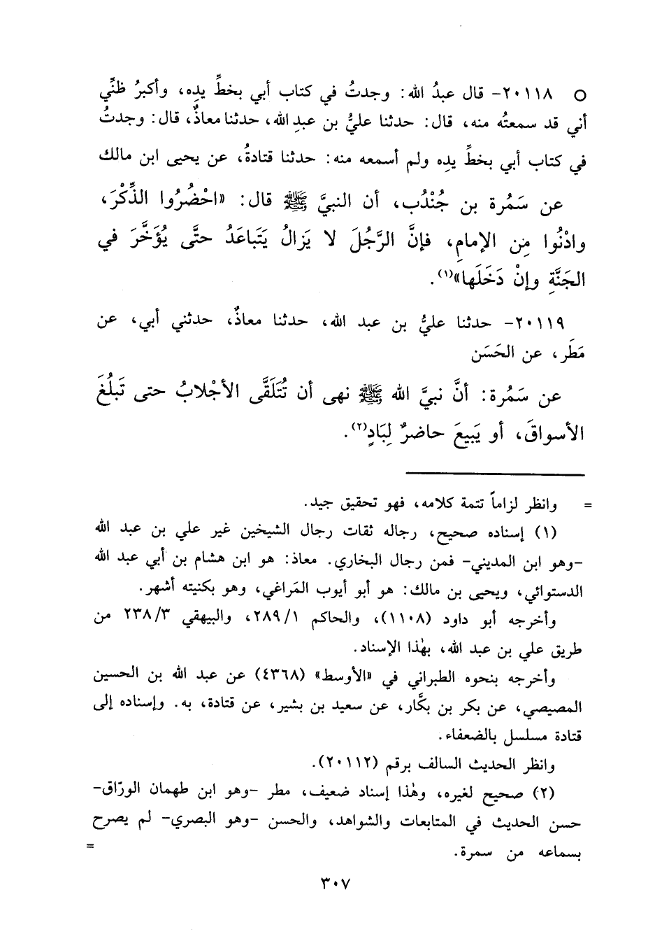 ° ٢٠١١٨ - قَالَ عَبْدُ اللهِ: " وَجَدْتُ فِي كِتَابِ أَبِي بِخَطِّ يَدِهِ، وَأَكْبَرُ ظَنِّي أَنِّي قَدْ سَمِعْتُهُ مِنْهُ، قَالَ: حَدَّثَنَا عَلِيُّ بْنُ عَبْدِ اللهِ، حَدَّثَنَا مُعَاذٌ، قَالَ: وَجَدْتُ فِي كِتَابِ أَبِي بِخَطِّ يَدِهِ وَلَمْ أَسْمَعْهُ مِنْهُ، حَدَّثَنَا قَتَادَةُ، عَنْ يَحْيَى بْنِ مَالِكٍ، عَنْ سَمُرَةَ بْنِ جُنْدُبٍ، أَنَّ النَّبِيَّ صَلَّى اللهُ عَلَيْهِ وَسَلَّمَ قَالَ: " احْضُرُوا الذِّكْرَ، وَادْنُوا مِنَ الْإِمَامِ، فَإِنَّ الرَّجُلَ لَا يَزَالُ يَتَبَاعَدُ حَتَّى يُؤَخَّرَ فِي الْجَنَّةِ، وَإِنْ دَخَلَهَا " (١)