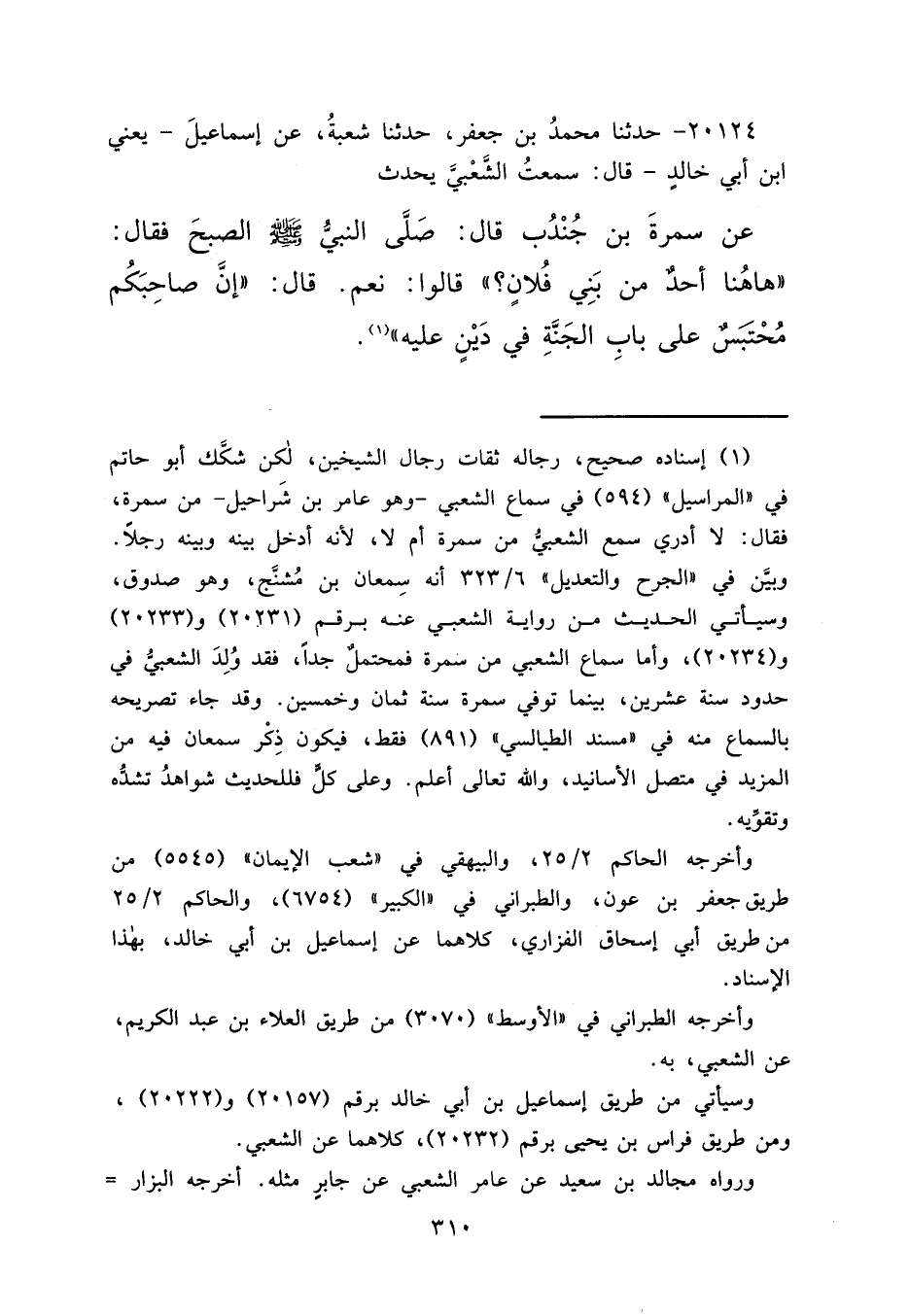 ٢٠١٢٤ - حَدَّثَنَا مُحَمَّدُ بْنُ جَعْفَرٍ، حَدَّثَنَا شُعْبَةُ، عَنْ إِسْمَاعِيلَ يَعْنِي ابْنَ أَبِي خَالِدٍ، قَالَ: سَمِعْتُ الشَّعْبِيَّ، يُحَدِّثُ عَنْ سَمُرَةَ بْنِ جُنْدُبٍ، قَالَ: صَلَّى النَّبِيُّ صَلَّى اللهُ عَلَيْهِ وَسَلَّمَ الصُّبْحَ، فَقَالَ: " هَاهُنَا أَحَدٌ مِنْ بَنِي فُلَانٍ "، قَالُوا: نَعَمْ، قَالَ: " إِنَّ صَاحِبَكُمْ مُحْتَبَسٌ عَلَى بَابِ الْجَنَّةِ فِي دَيْنٍ عَلَيْهِ " (١)
