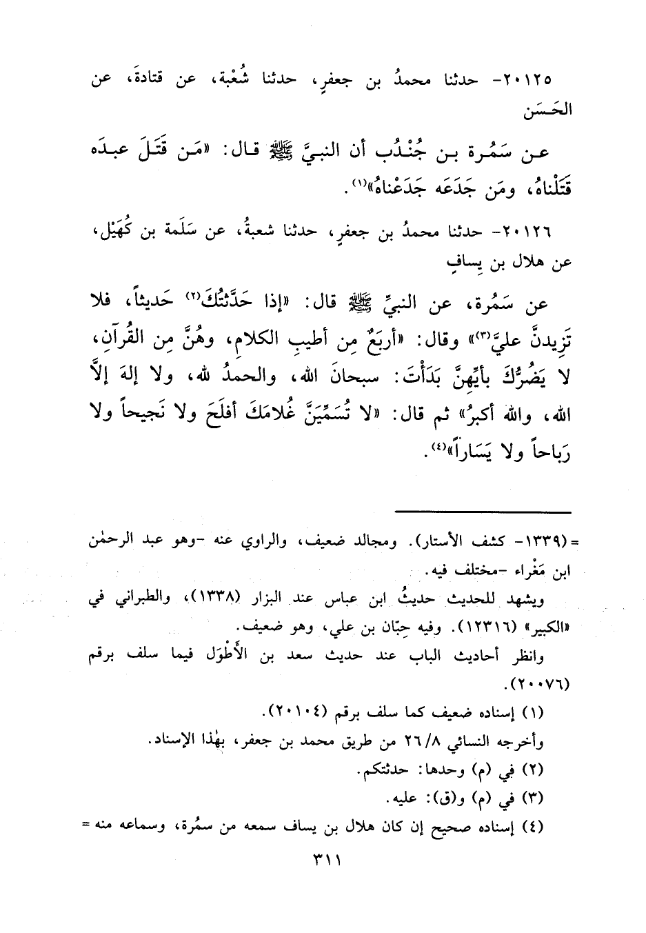 ٢٠١٢٦ - حَدَّثَنَا مُحَمَّدُ بْنُ جَعْفَرٍ، حَدَّثَنَا شُعْبَةُ، عَنْ سَلَمَةَ بْنِ كُهَيْلٍ، عَنْ هِلَالِ بْنِ يَسَافٍ، عَنْ سَمُرَةَ، عَنِ النَّبِيِّ صَلَّى اللهُ عَلَيْهِ وَسَلَّمَ قَالَ: " إِذَا حَدَّثْتُكَ (٢) حَدِيثًا، فَلَا تَزِيدَنَّ عَلَيَّ " (٣)