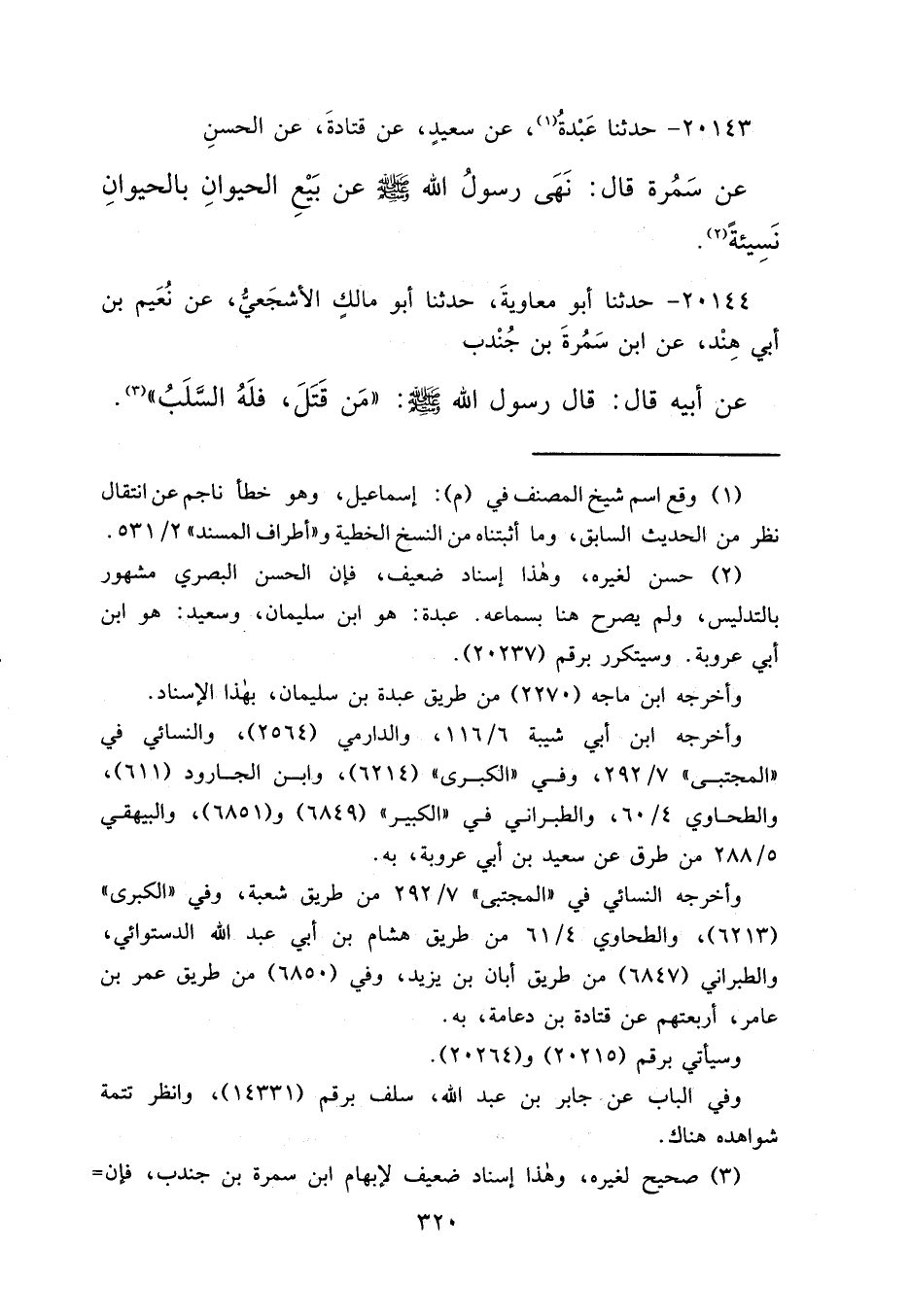 ٢٠١٤٣ - حَدَّثَنَا عَبَدَةُ، (١) عَنْ سَعِيدٍ، عَنْ قَتَادَةَ، عَنِ الْحَسَنِ، عَنْ سَمُرَةَ، قَالَ: " نَهَى رَسُولُ اللهِ صَلَّى اللهُ عَلَيْهِ وَسَلَّمَ عَنْ بَيْعِ الْحَيَوَانِ بِالْحَيَوَانِ نَسِيئَةً " (٢)