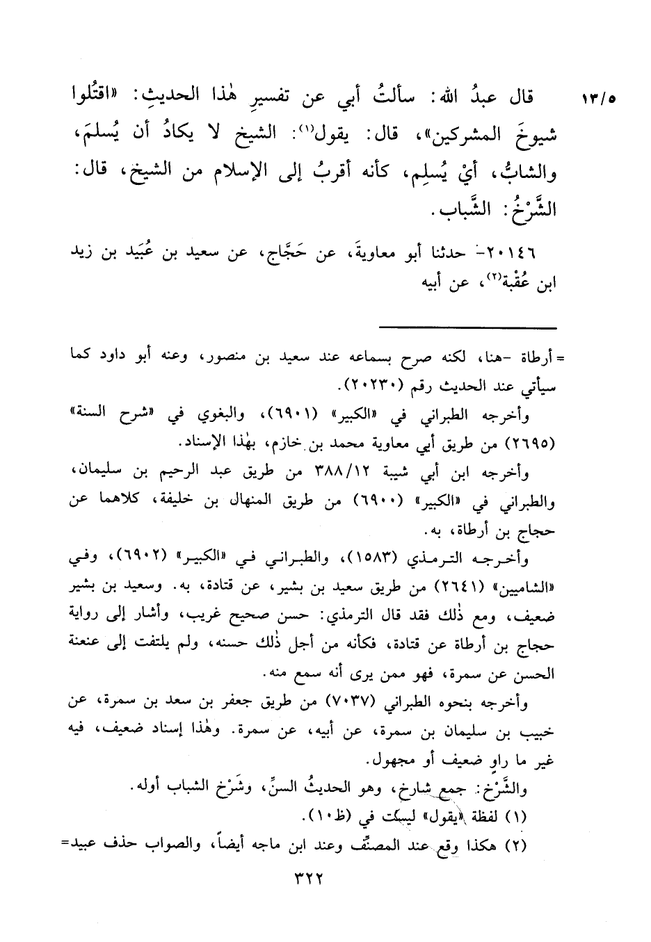 قَالَ عَبْدُ اللهِ: سَأَلْتُ أَبِي عَنْ تَفْسِيرِ هَذَا الْحَدِيثِ: " اقْتُلُوا شُيُوخَ الْمُشْرِكِينَ "، قَالَ: يَقُولُ: " (١) الشَّيْخُ لَا يَكَادُ أَنْ يُسْلِمَ، وَالشَّابُّ، أَيْ يُسْلِمُ، كَأَنَّهُ أَقْرَبُ إِلَى الْإِسْلَامِ مِنَ الشَّيْخِ "، قَالَ: " الشَّرْخُ: الشَّبَابُ "