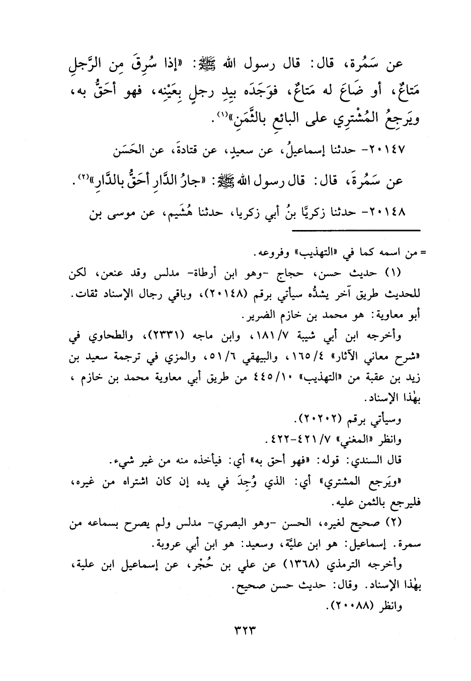 عَنْ سَمُرَةَ، قَالَ: قَالَ رَسُولُ اللهِ صَلَّى اللهُ عَلَيْهِ وَسَلَّمَ: " إِذَا سُرِقَ مِنَ الرَّجُلِ مَتَاعٌ، أَوْ ضَاعَ لَهُ مَتَاعٌ، فَوَجَدَهُ بِيَدِ رَجُلٍ بِعَيْنِهِ، فَهُوَ أَحَقُّ بِهِ، وَيَرْجِعُ الْمُشْتَرِي عَلَى الْبَائِعِ بِالثَّمَنِ " (١)