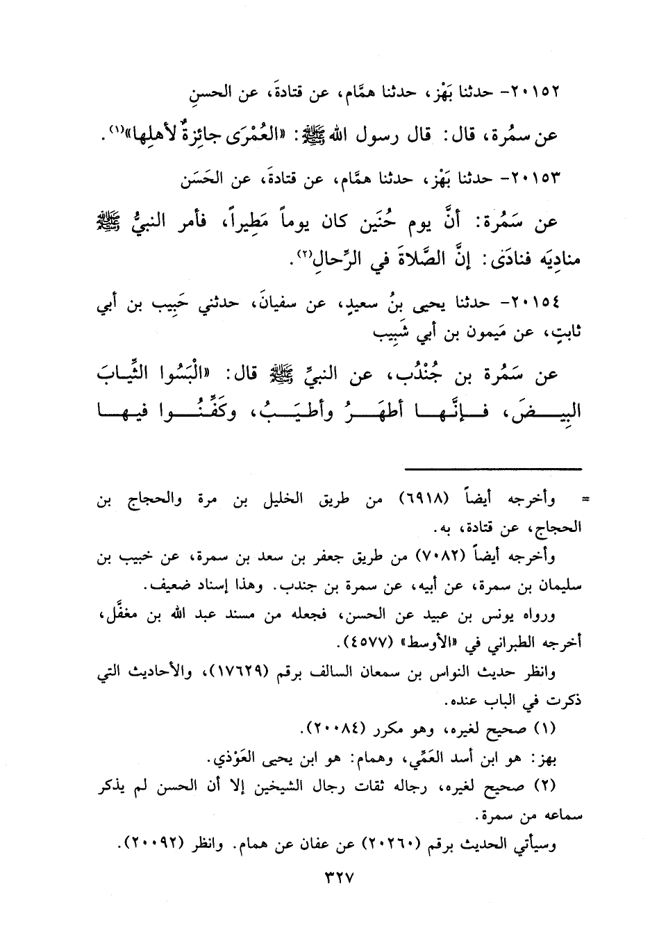 ٢٠١٥٢ - حَدَّثَنَا بَهْزٌ، حَدَّثَنَا هَمَّامٌ، عَنْ قَتَادَةَ، عَنِ الْحَسَنِ، عَنْ سَمُرَةَ، قَالَ: قَالَ رَسُولُ اللهِ صَلَّى اللهُ عَلَيْهِ وَسَلَّمَ: " الْعُمْرَى جَائِزَةٌ لِأَهْلِهَا " (١)