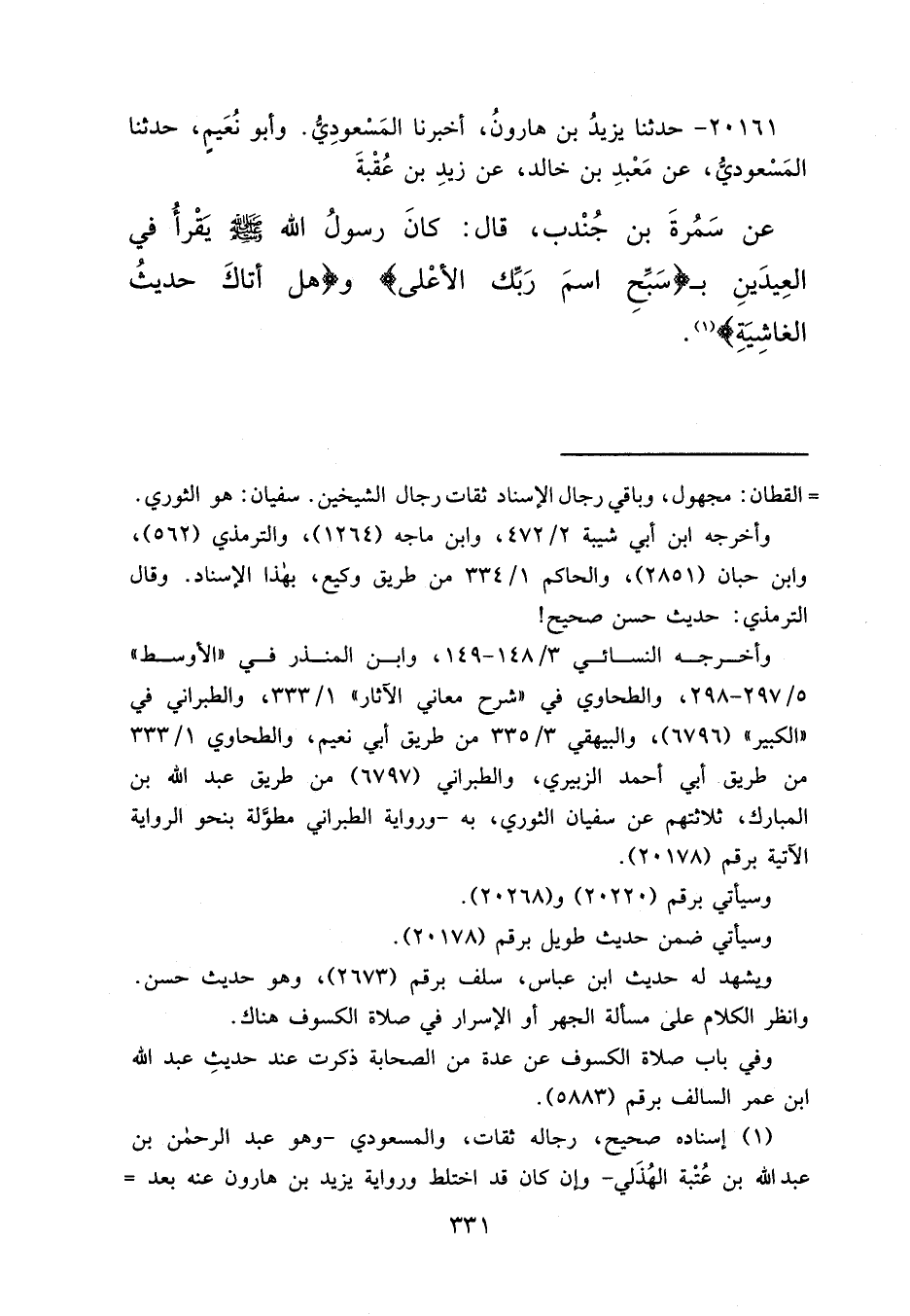٢٠١٦١ - حَدَّثَنَا يَزِيدُ بْنُ هَارُونَ، أَخْبَرَنَا الْمَسْعُودِيُّ، وَأَبُو نُعَيْمٍ، حَدَّثَنَا الْمَسْعُودِيُّ، عَنْ مَعْبَدِ بْنِ خَالِدٍ، عَنْ زَيْدِ بْنِ عُقْبَةَ، عَنْ سَمُرَةَ بْنِ جُنْدُبٍ، قَالَ: " كَانَ رَسُولُ اللهِ صَلَّى اللهُ عَلَيْهِ وَسَلَّمَ يَقْرَأُ فِي الْعِيدَيْنِ بِسَبِّحِ اسْمَ رَبِّكَ الْأَعْلَى، وَهَلْ أَتَاكَ حَدِيثُ الْغَاشِيَةِ " (١)