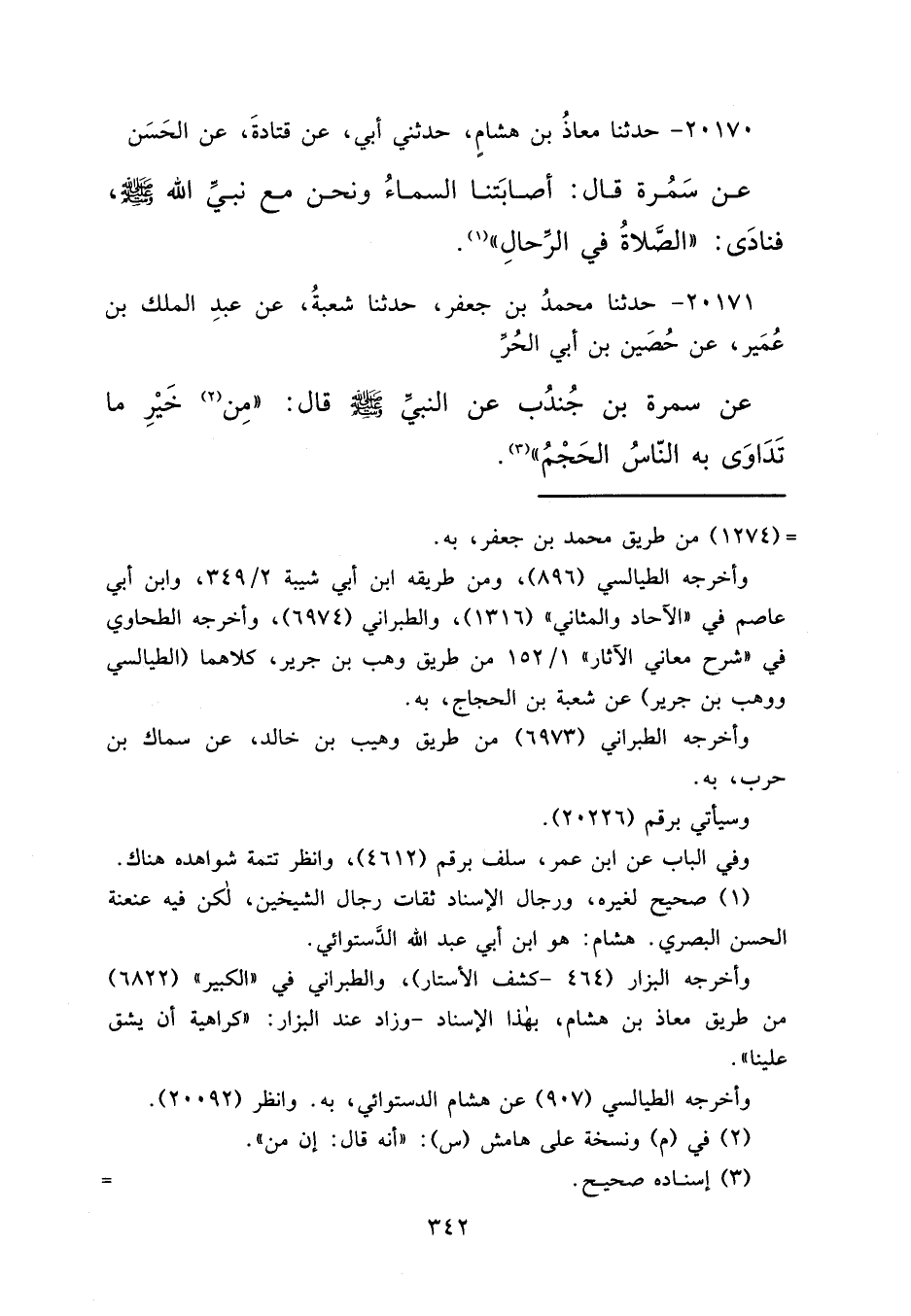 ٢٠١٧٠ - حَدَّثَنَا مُعَاذُ بْنُ هِشَامٍ، حَدَّثَنِي أَبِي، عَنْ قَتَادَةَ، عَنِ الْحَسَنِ، عَنْ سَمُرَةَ، قَالَ: " أَصَابَتْنَا السَّمَاءُ وَنَحْنُ مَعَ نَبِيِّ اللهِ صَلَّى اللهُ عَلَيْهِ وَسَلَّمَ، فَنَادَى: الصَّلَاةُ فِي الرِّحَالِ " (١)