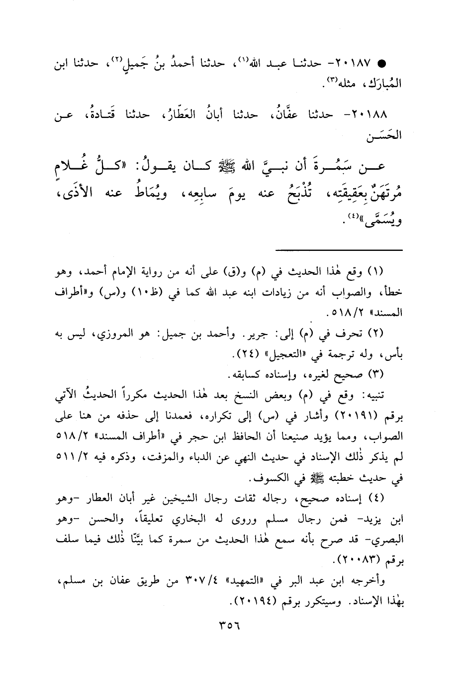 ٢٠١٨٨ - حَدَّثَنَا عَفَّانُ، حَدَّثَنَا أَبَانُ الْعَطَّارُ، حَدَّثَنَا قَتَادَةُ، عَنِ الْحَسَنِ، عَنْ سَمُرَةَ، أَنَّ نَبِيَّ اللهِ صَلَّى اللهُ عَلَيْهِ وَسَلَّمَ كَانَ يَقُولُ: " كُلُّ غُلَامٍ مُرْتَهَنٌ بِعَقِيقَتِهِ، تُذْبَحُ عَنْهُ يَوْمَ سَابِعِهِ، وَيُمَاطُ عَنْهُ الْأَذَى، وَيُسَمَّى " (٤)