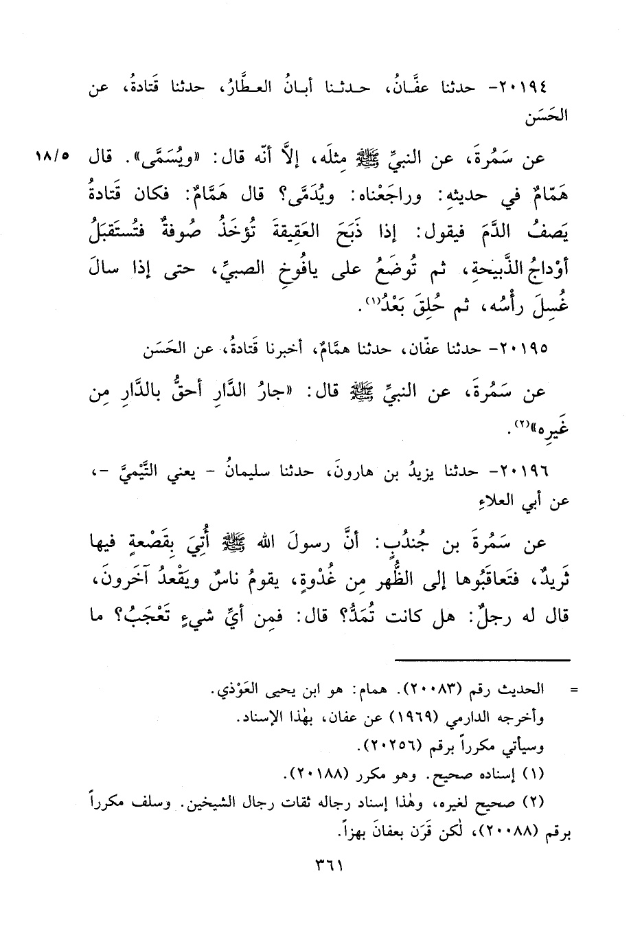 ٢٠١٩٤ - حَدَّثَنَا عَفَّانُ، حَدَّثَنَا أَبَانُ الْعَطَّارُ، حَدَّثَنَا قَتَادَةُ، عَنِ الْحَسَنِ، عَنِ سَمُرَةَ، عَنِ النَّبِيِّ صَلَّى اللهُ عَلَيْهِ وَسَلَّمَ مِثْلَهُ إِلَّا أَنَّهُ قَالَ: " وَيُسَمَّى "، قَالَ هَمَّامٌ فِي حَدِيثِهِ: وَرَاجَعْنَاهُ: " وَيُدَمَّى "، قَالَ هَمَّامٌ: فَكَانَ قَتَادَةُ يَصِفُ الدَّمَ فَيَقُولُ: " إِذَا ذَبَحَ الْعَقِيقَةَ تُؤْخَذُ صُوفَةٌ، فَتُسْتَقْبَلُ أَوْدَاجُ الذَّبِيحَةِ، ثُمَّ تُوضَعُ عَلَى يَافُوخِ الصَّبِيِّ، حَتَّى إِذَا سَالَ غُسِلَ رَأْسُهُ، ثُمَّ حُلِقَ بَعْدُ " (١)