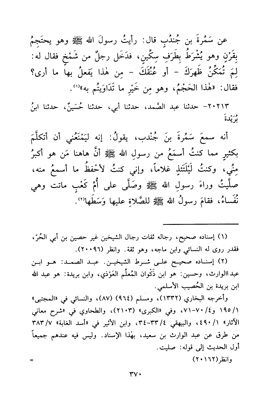 ٢٠٢١٣ - حَدَّثَنَا عَبْدُ الصَّمَدِ، حَدَّثَنَا أَبِي، حَدَّثَنَا حُسَيْنٌ، حَدَّثَنَا ابْنُ بُرَيْدَةَ، أَنَّهُ سَمِعَ سَمُرَةَ بْنَ جُنْدُبٍ، يَقُولُ: إِنَّهُ لَيَمْنَعُنِي أَنْ أَتَكَلَّمَ بِكَثِيرٍ مِمَّا كُنْتُ أَسْمَعُ مِنْ رَسُولِ اللهِ صَلَّى اللهُ عَلَيْهِ وَسَلَّمَ أَنَّ هَاهُنَا مَنْ هُوَ أَكْبَرُ مِنِّي، وَكُنْتُ لَيْلَتَئِذٍ غُلَامًا، وَإِنِّي كُنْتُ لَأَحْفَظُ مَا أَسْمَعُ مِنْهُ، " صَلَّيْتُ وَرَاءَ رَسُولِ اللهِ صَلَّى اللهُ عَلَيْهِ وَسَلَّمَ، وَصَلَّى عَلَى أُمِّ كَعْبٍ، مَاتَتْ وَهِيَ نُفَسَاءُ، فَقَامَ رَسُولُ اللهِ صَلَّى اللهُ عَلَيْهِ وَسَلَّمَ لِلصَّلَاةِ عَلَيْهَا وَسَطَهَا " (٢)