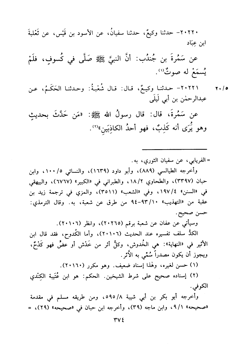 ٢٠٢٢١ - حَدَّثَنَا وَكِيعٌ، قَالَ: قَالَ شُعْبَةُ: وَحَدَّثَنَا الْحَكَمُ، عَنْ عَبْدِ الرَّحْمَنِ بْنِ أَبِي لَيْلَى، عَنْ سَمُرَةَ، قَالَ: قَالَ رَسُولُ اللهِ صَلَّى اللهُ عَلَيْهِ وَسَلَّمَ: " مَنْ حَدَّثَ بِحَدِيثٍ وَهُوَ يَرَى أَنَّهُ كَذِبٌ، فَهُوَ أَحَدُ الْكَاذِبِينَ " (٢)