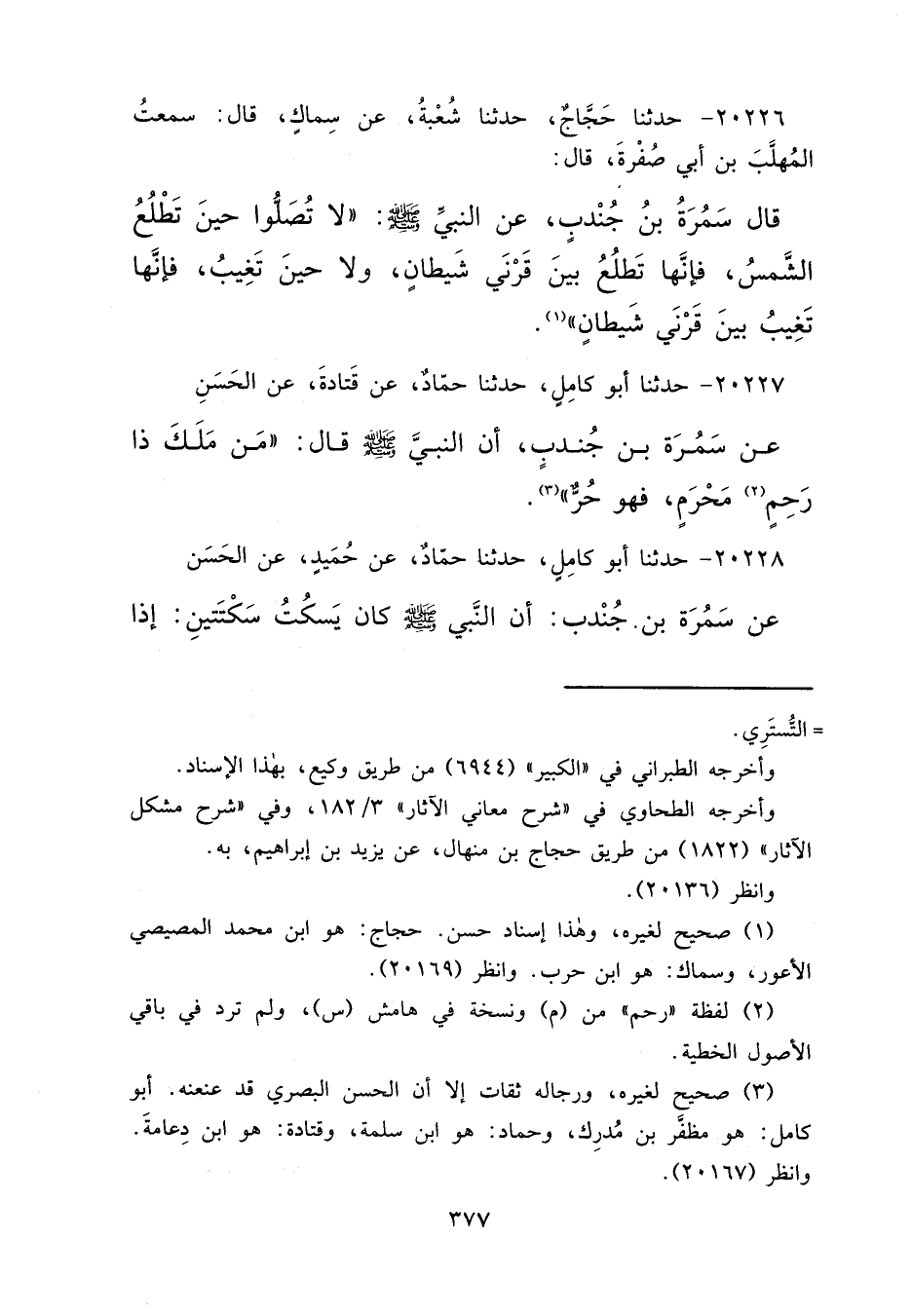 ٢٠٢٢٦ - حَدَّثَنَا حَجَّاجٌ، حَدَّثَنَا شُعْبَةُ، عَنْ سِمَاكٍ، قَالَ: سَمِعْتُ الْمُهَلَّبَ بْنَ أَبِي صُفْرَةَ، قَالَ: قَالَ سَمُرَةُ بْنُ جُنْدُبٍ: عَنِ النَّبِيِّ صَلَّى اللهُ عَلَيْهِ وَسَلَّمَ: " لَا تُصَلُّوا حِينَ تَطْلُعُ الشَّمْسُ، فَإِنَّهَا تَطْلُعُ بَيْنَ قَرْنَيْ شَيْطَانٍ، وَلَا حِينَ تَغِيبُ، فَإِنَّهَا تَغِيبُ بَيْنَ قَرْنَيْ شَيْطَانٍ " (١)