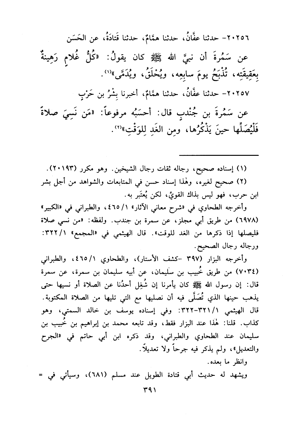 ٢٠٢٥٦ - حَدَّثَنَا عَفَّانُ، حَدَّثَنَا هَمَّامٌ، حَدَّثَنَا قَتَادَةُ، عَنِ الْحَسَنِ، عَنْ سَمُرَةَ، أَنَّ نَبِيَّ اللهِ صَلَّى اللهُ عَلَيْهِ وَسَلَّمَ كَانَ يَقُولُ: " كُلُّ غُلَامٍ رَهِينَةٌ بِعَقِيقَتِهِ، تُذْبَحُ يَوْمَ سَابِعِهِ، وَيُحْلَقُ وَيُدَمَّى " (١)