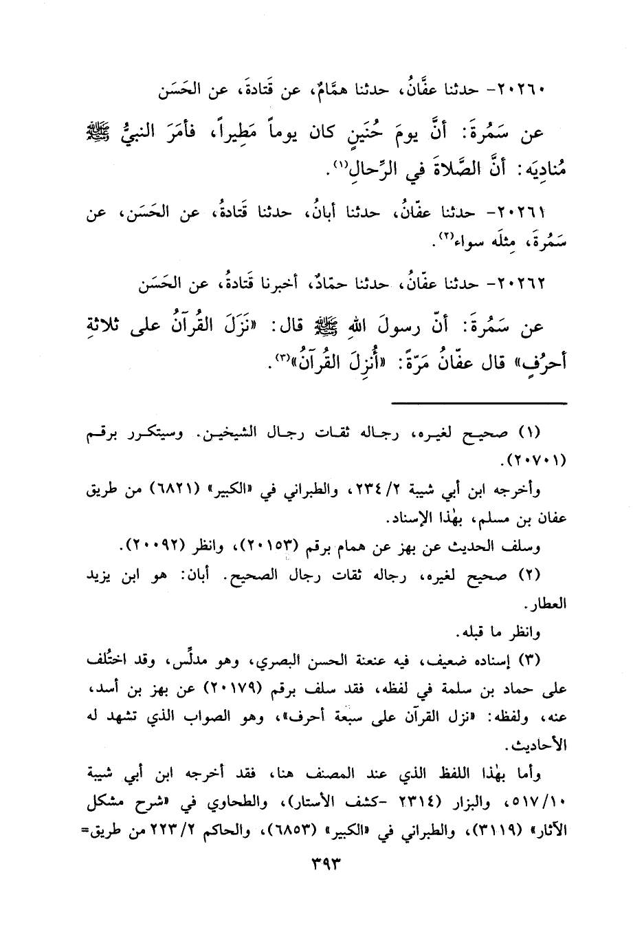 ٢٠٢٦٢ - حَدَّثَنَا عَفَّانُ، حَدَّثَنَا حَمَّادٌ، أَخْبَرَنَا قَتَادَةُ، عَنِ الْحَسَنِ، عَنْ سَمُرَةَ أَنَّ رَسُولَ اللهِ صَلَّى اللهُ عَلَيْهِ وَسَلَّمَ قَالَ: " نَزَلَ الْقُرْآنُ عَلَى ثَلَاثَةِ أَحْرُفٍ "، قَالَ عَفَّانُ مَرَّةً: أُنْزِلَ الْقُرْآنُ (٣)