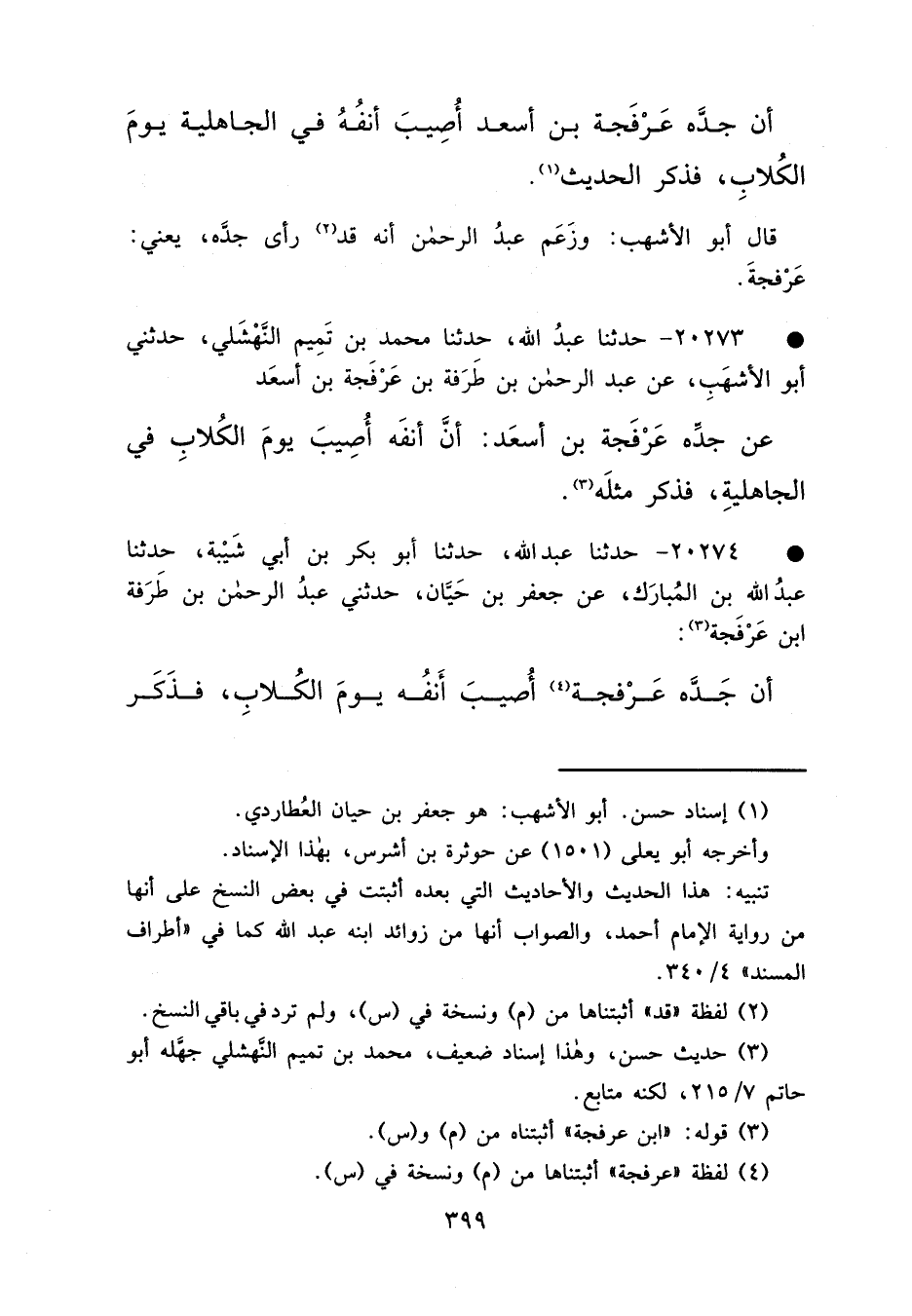 • ٢٠٢٧٤ - حَدَّثَنَا عَبْدُ اللهِ حَدَّثَنَا أَبُو بَكْرِ بْنُ أَبِي شَيْبَةَ، حَدَّثَنَا عَبْدُ اللهِ بْنُ الْمُبَارَكِ، عَنْ جَعْفَرِ بْنِ حَيَّانَ، حَدَّثَنِي عَبْدُ الرَّحْمَنِ بْنُ طَرَفَةَ بْنِ عَرْفَجَةَ (٣) ، أَنَّ جَدَّهُ عَرْفَجَةَ (٤) أُصِيبَ أَنْفُهُ يَوْمَ الْكِلَابِ، فَذَكَرَ