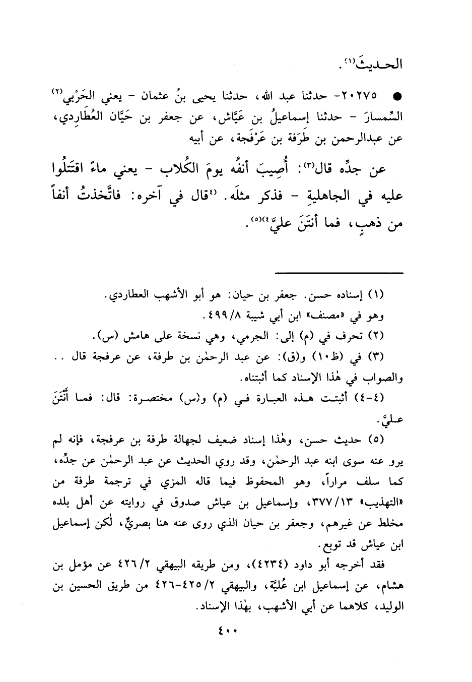 • ٢٠٢٧٥ - حَدَّثَنَا عَبْدُ اللهِ حَدَّثَنَا يَحْيَى بْنُ عُثْمَانَ يَعْنِي الْحَرْبِيَّ (٢) السِّمْسَارَ، حَدَّثَنَا إِسْمَاعِيلُ بْنُ عَيَّاشٍ، عَنْ جَعْفَرِ بْنِ حَيَّانَ الْعُطَارِدِيِّ، عَنْ عَبْدِ الرَّحْمَنِ بْنِ طَرَفَةَ بْنِ عَرْفَجَةَ، عَنْ أَبِيهِ، عَنْ جَدِّهِ، قَالَ: (٣) أُصِيبَ أَنْفُهُ يَوْمَ الْكُلَابِ، يَعْنِي مَاءً، اقْتَتَلُوا عَلَيْهِ فِي الْجَاهِلِيَّةِ، فَذَكَرَ مِثْلَهُ قَالَ فِي آخِرِهِ: فَاتَّخَذْتُ أَنْفًا مِنْ ذَهَبٍ: فَمَا أَنْتَنَ عَلَيَّ (٤) (٥)