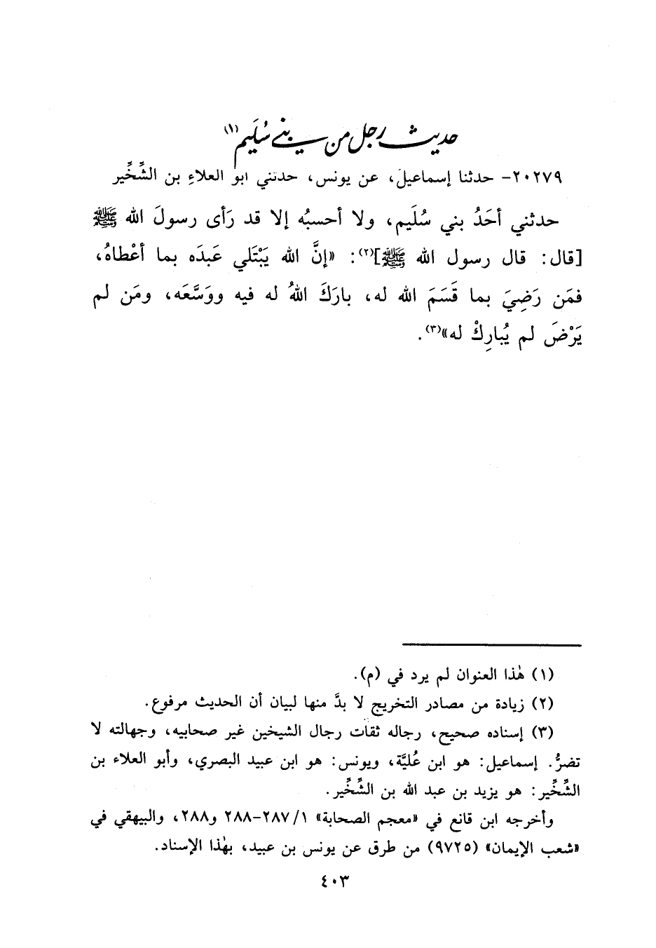 ٢٠٢٧٩ - حَدَّثَنَا إِسْمَاعِيلُ، عَنْ يُونُسَ، حَدَّثَنِي أَبُو الْعَلَاءِ بْنُ الشِّخِّيرِ، حَدَّثَنِي أَحَدُ بَنِي سُلَيْمٍ، وَلَا أَحْسَبُهُ إِلَّا قَدْ رَأَى رَسُولَ اللهِ صَلَّى اللهُ عَلَيْهِ وَسَلَّمَ، (٢) " أَنَّ اللهَ يَبْتَلِي عَبْدَهُ بِمَا أَعْطَاهُ، فَمَنْ رَضِيَ بِمَا قَسَمَ اللهُ لَهُ، بَارَكَ اللهُ لَهُ فِيهِ، وَوَسَّعَهُ، وَمَنْ لَمْ يَرْضَ لَمْ يُبَارِكْ لَهُ " (٣)