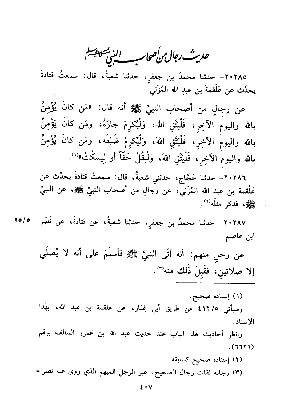 ٢٠٢٨٧ - حَدَّثَنَا مُحَمَّدُ بْنُ جَعْفَرٍ، حَدَّثَنَا شُعْبَةُ، عَنْ قَتَادَةَ، عَنْ نَصْرِ بْنِ عَاصِمٍ، عَنْ رَجُلٍ مِنْهُمْ، " أَنَّهُ أَتَى النَّبِيَّ صَلَّى اللهُ عَلَيْهِ وَسَلَّمَ فَأَسْلَمَ عَلَى أَنَّهُ لَا يُصَلِّي إِلَّا صَلَاتَيْنِ، فَقَبِلَ ذَلِكَ مِنْهُ " (٣)