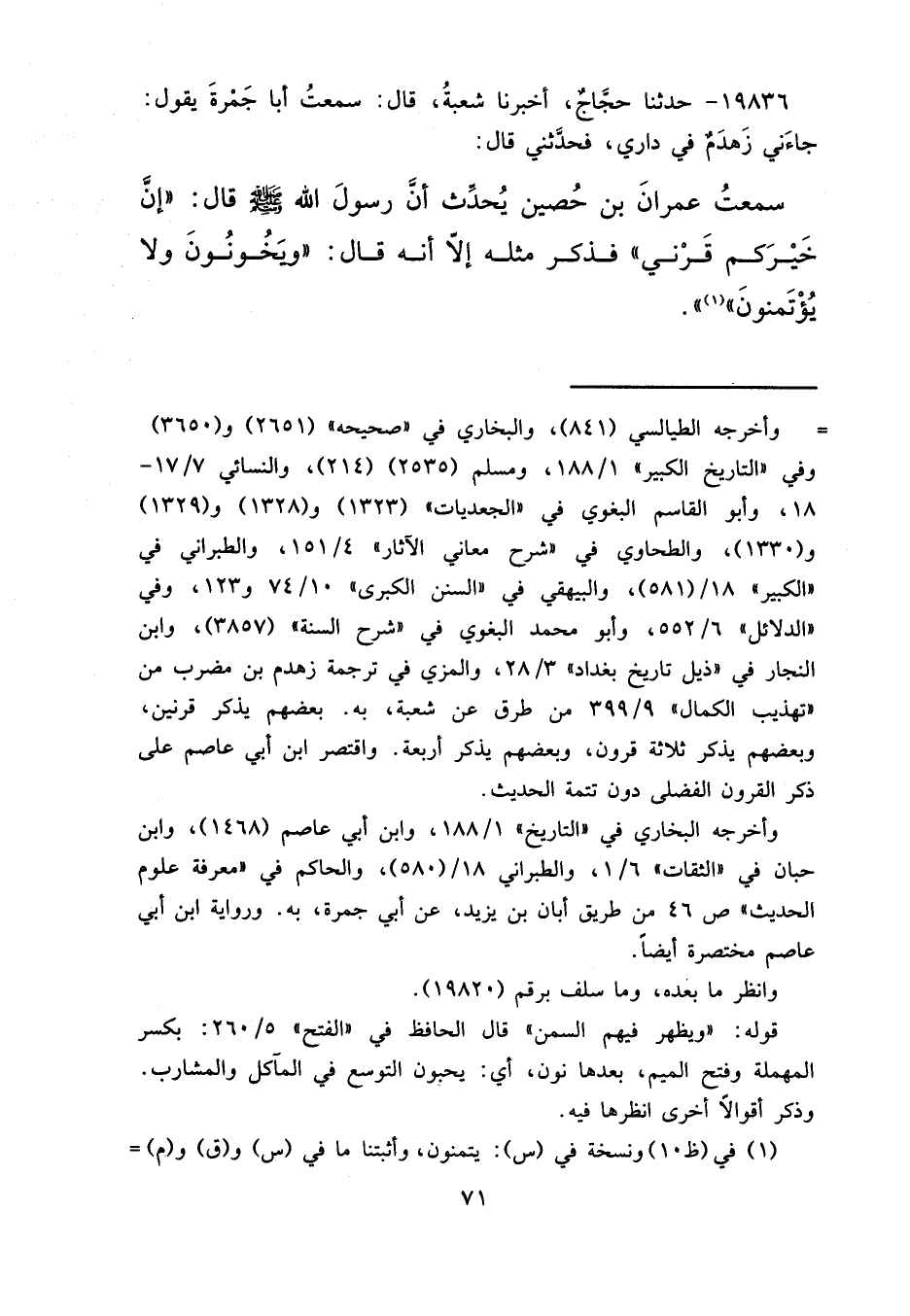 ١٩٨٣٦ - حَدَّثَنَا حَجَّاجٌ، أَخْبَرَنَا شُعْبَةُ قَالَ: سَمِعْتُ أَبَا جَمْرَةَ يَقُولُ: جَاءَنِي زَهْدَمٌ فِي دَارِي فَحَدَّثَنِي قَالَ: سَمِعْتُ عِمْرَانَ بْنَ حُصَيْنٍ يُحَدِّثُ، أَنَّ رَسُولَ اللهِ صَلَّى اللهُ عَلَيْهِ وَسَلَّمَ قَالَ: " إِنَّ خَيْرَكُمْ قَرْنِي "، فَذَكَرَ مِثْلَهُ إِلَّا أَنَّهُ قَالَ: " وَيَخُونُونَ وَلَا يُؤْتَمَنُونَ " (١)