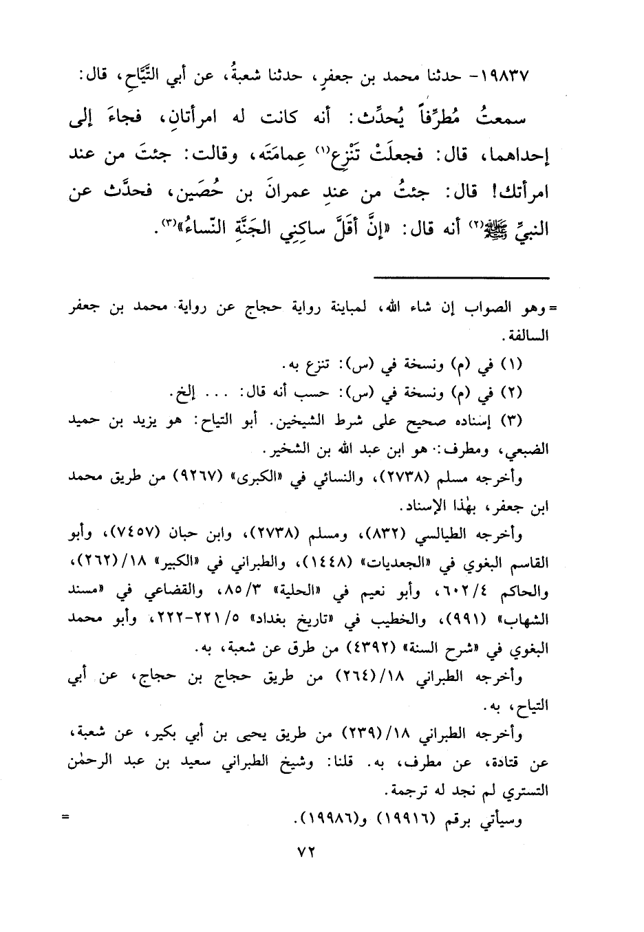 ١٩٨٣٧ - حَدَّثَنَا مُحَمَّدُ بْنُ جَعْفَرٍ، حَدَّثَنَا شُعْبَةُ، عَنْ أَبِي التَّيَّاحِ قَالَ: سَمِعْتُ مُطَرِّفًا يُحَدِّثُ: أَنَّهُ كَانَتْ لَهُ امْرَأَتَانِ فَجَاءَ إِلَى إِحْدَاهُمَا، قَالَ: فَجَعَلَتْ تَنْزِعُ (١) عِمَامَتَهُ وَقَالَتْ: جِئْتَ مِنْ عِنْدِ امْرَأَتِكَ. قَالَ: جِئْتُ مِنْ عِنْدِ عِمْرَانَ بْنِ حُصَيْنٍ فَحَدَّثَ، عَنِ النَّبِيِّ صَلَّى اللهُ عَلَيْهِ وَسَلَّمَ (٢) أَنَّهُ قَالَ: " إِنَّ أَقَلَّ سَاكِنِي الْجَنَّةِ النِّسَاءُ " (٣)