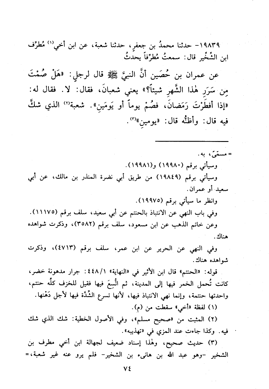 ١٩٨٣٩ - حَدَّثَنَا مُحَمَّدُ بْنُ جَعْفَرٍ، حَدَّثَنَا شُعْبَةُ، عَنِ ابْنِ أَخِي (١) مُطَرِّفِ بْنِ الشِّخِّيرِ قَالَ: سَمِعْتُ مُطَرِّفًا يُحَدِّثُ، عَنْ عِمْرَانَ بْنِ حُصَيْنٍ، أَنَّ النَّبِيَّ صَلَّى اللهُ عَلَيْهِ وَسَلَّمَ قَالَ لِرَجُلٍ: " هَلْ صُمْتَ مِنْ سُرَرِ هَذَا الشَّهْرِ شَيْئًا؟ "، يَعْنِي شَعْبَانَ، فَقَالَ: لَا.: فَقَالَ لَهُ: " إِذَا أَفْطَرْتَ رَمَضَانَ فَصُمْ يَوْمًا أَوْ يَوْمَيْنِ " شُعْبَةُ (٢) الَّذِي شَكَّ فِيهِ قَالَ: وَأَظُنُّهُ قَالَ: يَوْمَيْنِ (٣)