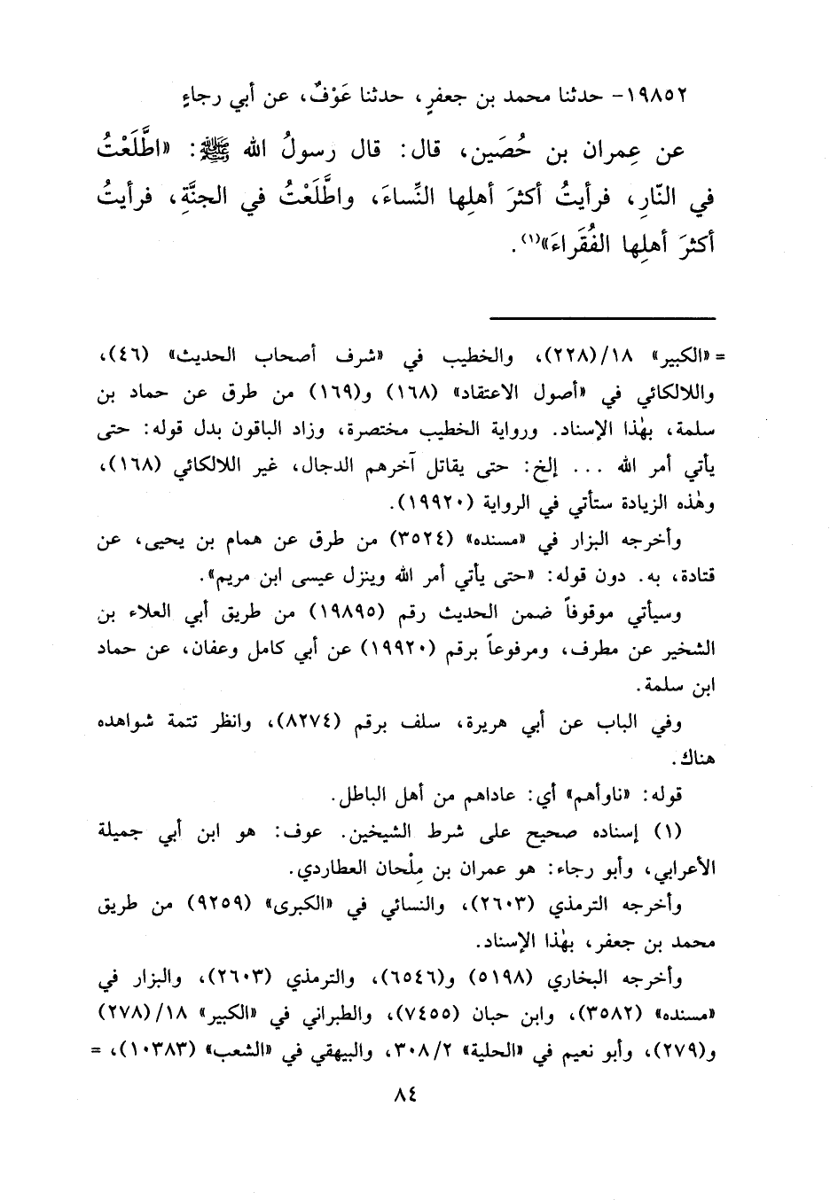 ١٩٨٥٢ - حَدَّثَنَا مُحَمَّدُ بْنُ جَعْفَرٍ، حَدَّثَنَا عَوْفٌ، عَنْ أَبِي رَجَاءٍ، عَنْ عِمْرَانَ بْنِ حُصَيْنٍ قَالَ: قَالَ رَسُولُ اللهِ صَلَّى اللهُ عَلَيْهِ وَسَلَّمَ: " اطَّلَعْتُ فِي النَّارِ فَرَأَيْتُ أَكْثَرَ أَهْلِهَا النِّسَاءَ، وَاطَّلَعْتُ فِي الْجَنَّةِ فَرَأَيْتُ أَكْثَرَ أَهْلِهَا الْفُقَرَاءَ " (١)