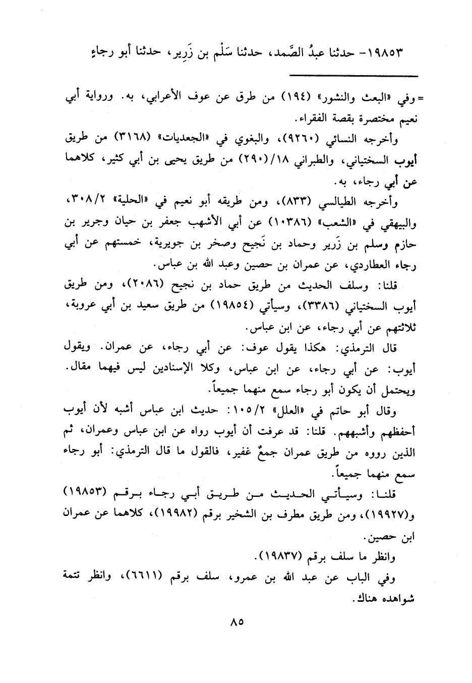 قال الترمذي: هكذا يقول عوف: عن أبي رجاء، عن عمران. ويقول أيوب: عن أبي رجاء، عن ابن عباس، وكلا الإسنادين ليس فيهما مقال.