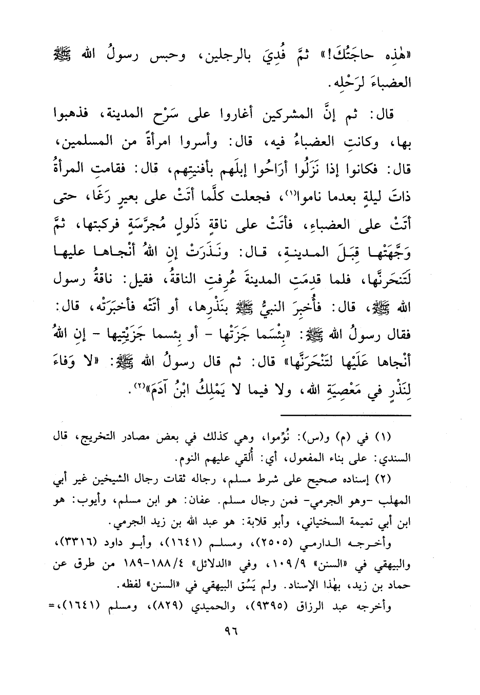 هَذِهِ حَاجَتُكَ ". ثُمَّ فُدِيَ بِالرَّجُلَيْنِ، وَحَبَسَ رَسُولُ اللهِ صَلَّى اللهُ عَلَيْهِ وَسَلَّمَ الْعَضْبَاءَ لِرَحْلِهِ. قَالَ: ثُمَّ إِنَّ الْمُشْرِكِينَ أَغَارُوا عَلَى سَرْحِ الْمَدِينَةِ فَذَهَبُوا بِهَا وَكَانَتِ الْعَضْبَاءُ فِيهِ. قَالَ: وَأَسَرُوا امْرَأَةً مِنَ الْمُسْلِمِينَ. قَالَ: فَكَانُوا إِذَا نَزَلُوا أَرَاحُوا إِبِلَهُمْ بِأَفْنِيَتِهِمْ قَالَ: فَقَامَتِ الْمَرْأَةُ ذَاتَ لَيْلَةٍ بَعْدَمَا نَامُوا، (١) فَجَعَلَتْ كُلَّمَا أَتَتْ عَلَى بَعِيرٍ رَغَا حَتَّى أَتَتْ عَلَى الْعَضْبَاءِ فَأَتَتْ عَلَى نَاقَةٍ ذَلُولٍ مُجَرَّسَةٍ فَرَكِبَتْهَا، ثُمَّ وَجَّهَتْهَا قِبَلَ الْمَدِينَةِ قَالَ: وَنَذَرَتْ إِنِ اللهُ أَنْجَاهَا عَلَيْهَا لَتَنْحَرَنَّهَا، فَلَمَّا قَدِمَتِ الْمَدِينَةَ عُرِفَتِ النَّاقَةُ فَقِيلَ نَاقَةُ رَسُولِ اللهِ صَلَّى اللهُ عَلَيْهِ وَسَلَّمَ: قَالَ فَأُخْبِرَ النَّبِيُّ صَلَّى اللهُ عَلَيْهِ وَسَلَّمَ بِنَذْرِهَا، أَوْ أَتَتْهُ فَأَخْبَرَتْهُ، قَالَ: فَقَالَ رَسُولُ اللهِ صَلَّى اللهُ عَلَيْهِ وَسَلَّمَ " بِئْسَمَا جَزَتْهَا أَوْ بِئْسَمَا جَزَيْتِيهَا ". إِنِ اللهُ أَنْجَاهَا عَلَيْهَا لَتَنْحَرَنَّهَا. قَالَ: ثُمَّ قَالَ رَسُولُ اللهِ صَلَّى اللهُ عَلَيْهِ وَسَلَّمَ: " لَا وَفَاءَ لِنَذْرٍ فِي مَعْصِيَةِ اللهِ، وَلَا فِيمَا لَا يَمْلِكُ ابْنُ آدَمَ " (٢)