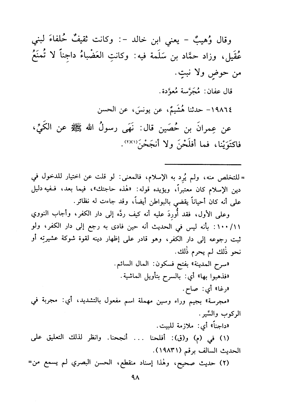 وقَالَ وُهَيْبٌ:، يَعْنِي ابْنَ خَالِدٍ، وَكَانَتْ ثَقِيفُ حُلَفَاءَ لِبَنِي عُقَيْلٍ. وَزَادَ حَمَّادُ بْنُ سَلَمَةَ فِيهِ وَكَانَتِ الْعَضْبَاءُ دَاجِنًا، لَا تُمْنَعُ مِنْ حَوْضٍ وَلَا نَبْتٍ. قَالَ عَفَّانُ مُجَرَّسَةٌ مُعَوَّدَةٌ