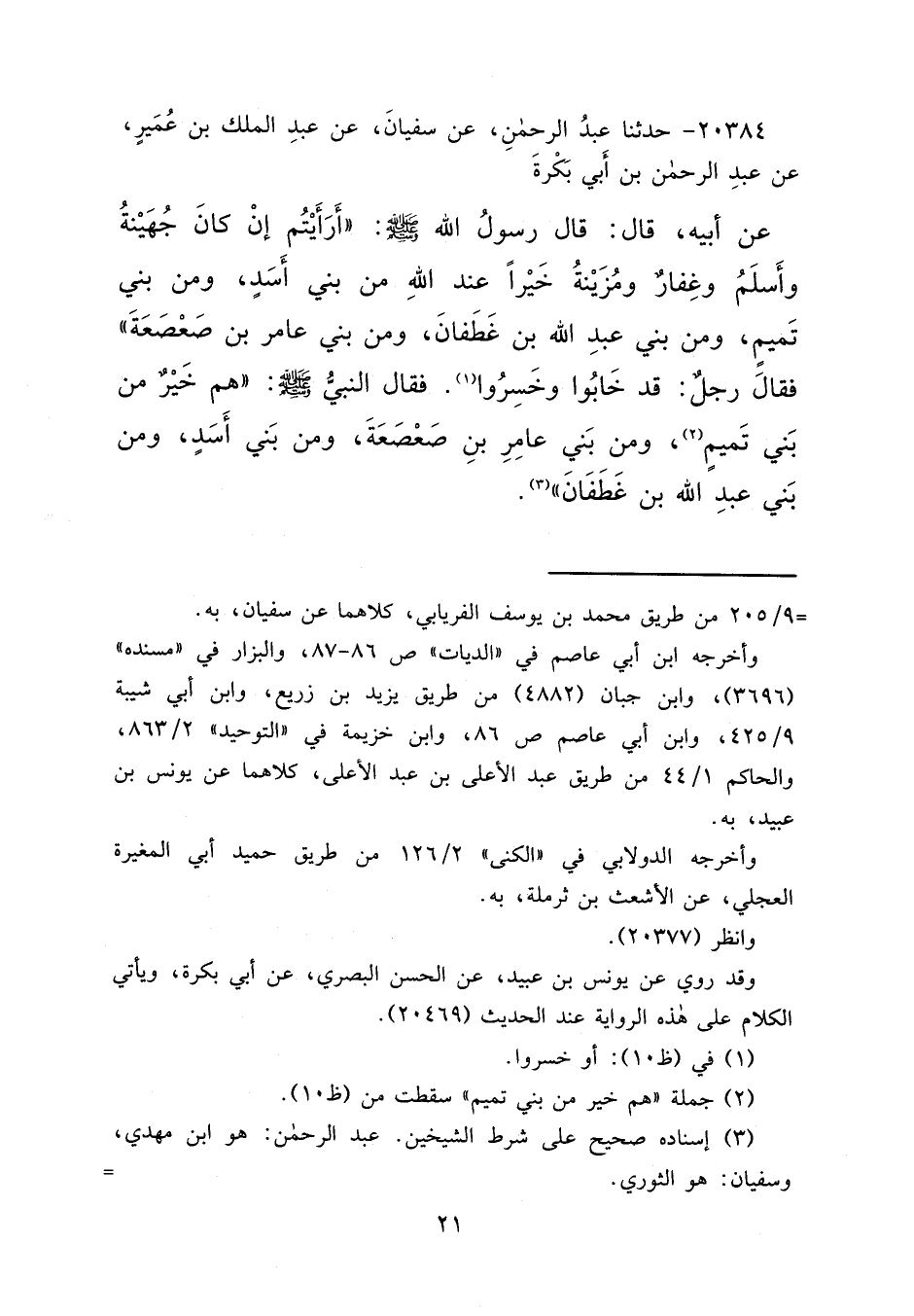 ٢٠٣٨٤ - حَدَّثَنَا عَبْدُ الرَّحْمَنِ، عَنْ سُفْيَانَ، عَنْ عَبْدِ الْمَلِكِ بْنِ عُمَيْرٍ، عَنْ عَبْدِ الرَّحْمَنِ بْنِ أَبِي بَكَرَةَ، عَنْ أَبِيهِ، قَالَ: قَالَ رَسُولُ اللهِ صَلَّى اللهُ عَلَيْهِ وَسَلَّمَ: " أَرَأَيْتُمْ إِنْ كَانَ جُهَيْنَةُ، وَأَسْلَمُ، وَغِفَارُ، وَمُزَيْنَةُ، خَيْرًا عِنْدَ اللهِ مِنْ بَنِي أَسَدٍ، وَمِنْ بَنِي تَمِيمٍ، وَمِنْ بَنِي عَبْدِ اللهِ بْنِ غَطَفَانَ، وَمِنْ بَنِي عَامِرِ بْنِ صَعْصَعَةَ "، فَقَالَ رَجُلٌ: قَدْ خَابُوا وَخَسِرُوا، (١) فَقَالَ النَّبِيُّ صَلَّى اللهُ عَلَيْهِ وَسَلَّمَ: " هُمْ خَيْرٌ مِنْ بَنِي تَمِيمٍ، (٢) وَمِنْ بَنِي عَامِرِ بْنِ صَعْصَعَةَ، وَمِنْ بَنِي أَسَدٍ، وَمِنْ بَنِي عَبْدِ اللهِ بْنِ غَطَفَانَ " (٣)