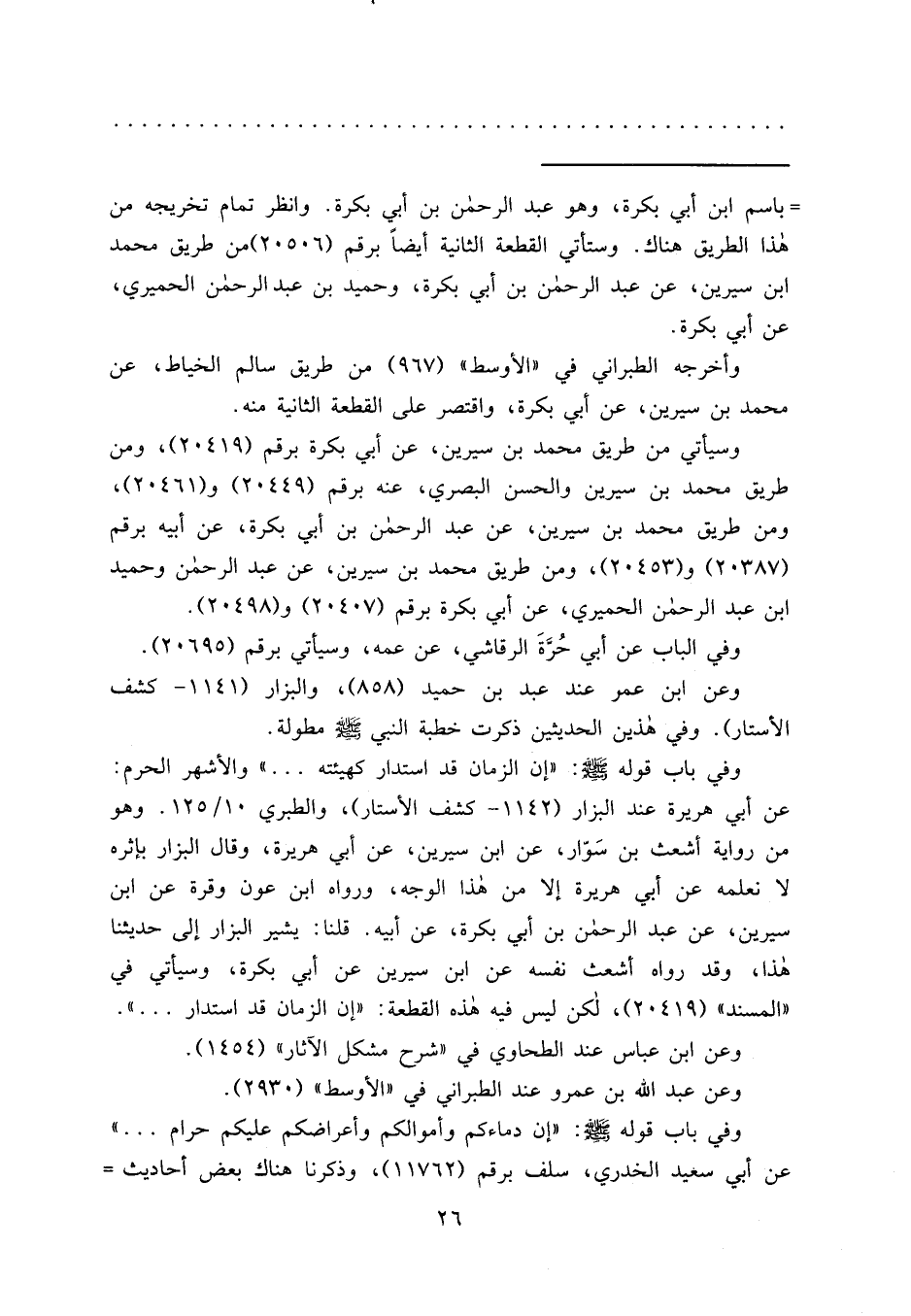 وسيأتي من طريق محمد بن سيرين، عن أبي بكرة برقم (٢٠٤١٩) ، ومن طريق محمد بن سيرين والحسن البصري، عنه برقم (٢٠٤٤٩) و (٢٠٤٦١) ، ومن طريق محمد بن سيرين، عن عبد الرحمن بن أبي بكرة، عن أبيه برقم (٢٠٣٨٧) و (٢٠٤٥٣) ، ومن طريق محمد بن سيرين، عن عبد الرحمن وحميد ابن عبد الرحمن الحميري، عن أبي بكرة برقم (٢٠٤٠٧) و (٢٠٤٩٨) .