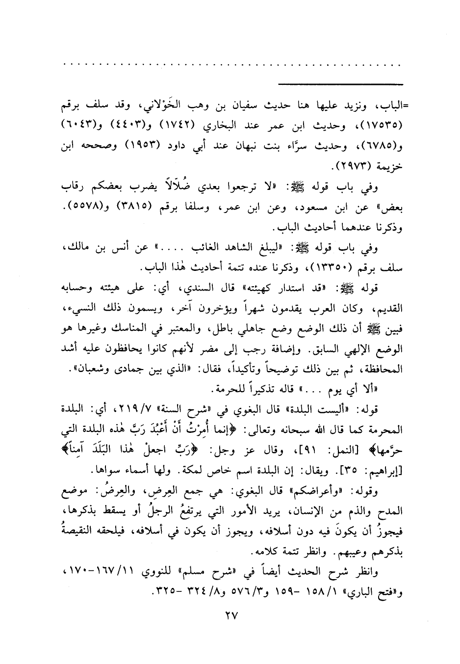 وفي باب قوله صَلَّى اللهُ عَلَيْهِ وَسَلَّمَ: "لا ترجعوا بعدي ضُلاّلاً يضرب بعضكم رقاب بعض" عن ابن مسعود، وعن ابن عمر، وسلفا برقم (٣٨١٥) و (٥٥٧٨) .
