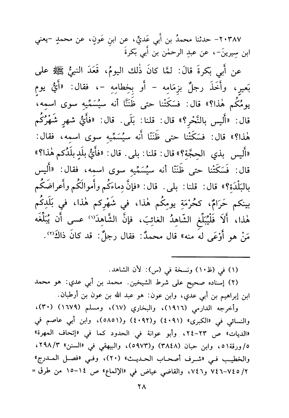 ٢٠٣٨٧ - حَدَّثَنَا مُحَمَّدُ بْنُ أَبِي عَدِيٍّ، عَنِ ابْنِ عَوْنٍ، عَنْ مُحَمَّدٍ يَعْنِي ابْنَ سِيرِينَ، عَنْ عَبْدِ الرَّحْمَنِ بْنِ أَبِي بَكَرَةَ، عَنْ أَبِي بَكَرَةَ، قَالَ: لَمَّا كَانَ ذَلِكَ الْيَوْمُ، قَعَدَ النَّبِيُّ صَلَّى اللهُ عَلَيْهِ وَسَلَّمَ عَلَى بَعِيرٍ، وَأَخَذَ رَجُلٌ بِزِمَامِهِ، أَوْ بِخِطَامِهِ، فَقَالَ: " أَيُّ يَوْمٍ يَوْمُكُمْ هَذَا؟ " قَالَ: فَسَكَتْنَا حَتَّى ظَنَنَّا أَنَّهُ سَيُسَمِّيهِ سِوَى اسْمِهِ، قَالَ: " أَلَيْسَ بِالنَّحْرِ؟ " قَالَ: قُلْنَا: بَلَى، قَالَ: " فَأَيُّ شَهْرٍ شَهْرُكُمْ هَذَا؟ " قَالَ: فَسَكَتْنَا حَتَّى ظَنَنَّا أَنَّهُ سَيُسَمِّيهِ سِوَى اسْمِهِ، فَقَالَ: " أَلَيْسَ بِذِي الْحِجَّةِ؟ " قَالَ: قُلْنَا: بَلَى، قَالَ: " فَأَيُّ بَلَدٍ بَلَدُكُمْ هَذَا؟ " قَالَ: فَسَكَتْنَا حَتَّى ظَنَنَّا أَنَّهُ سَيُسَمِّيهِ سِوَى اسْمِهِ، فَقَالَ: " أَلَيْسَ بِالْبَلْدَةِ؟ " قَالَ: قُلْنَا: بَلَى، قَالَ: " فَإِنَّ دِمَاءَكُمْ وَأَمْوَالَكُمْ وَأَعْرَاضَكُمْ بَيْنَكُمْ حَرَامٌ، كَحُرْمَةِ يَوْمِكُمْ هَذَا، فِي شَهْرِكُمْ هَذَا، فِي بَلَدِكُمْ هَذَا، أَلَا فَلْيُبَلِّغِ الشَّاهِدُ الْغَائِبَ، فَإِنَّ الشَّاهِدَ (١) عَسَى أَنْ يُبَلِّغَهُ مَنْ هُوَ أَوْعَى لَهُ مِنْهُ " قَالَ مُحَمَّدٌ: فَقَالَ رَجُلٌ: قَدْ كَانَ ذَاكَ (٢)