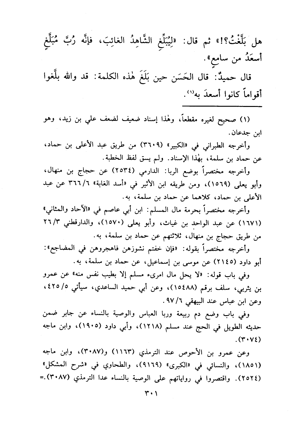 هَلْ بَلَّغْتُ؟ ثُمَّ قَالَ: لِيُبَلِّغِ الشَّاهِدُ الْغَائِبَ، فَإِنَّهُ رُبَّ مُبَلَّغٍ أَسْعَدُ مِنْ سَامِعٍ "، قَالَ حُمَيْدٌ: قَالَ الْحَسَنُ حِينَ بَلَّغَ هَذِهِ الْكَلِمَةَ: " قَدْ وَاللهِ بَلَّغُوا، أَقْوَامًا كَانُوا أَسْعَدَ بِهِ " (١)