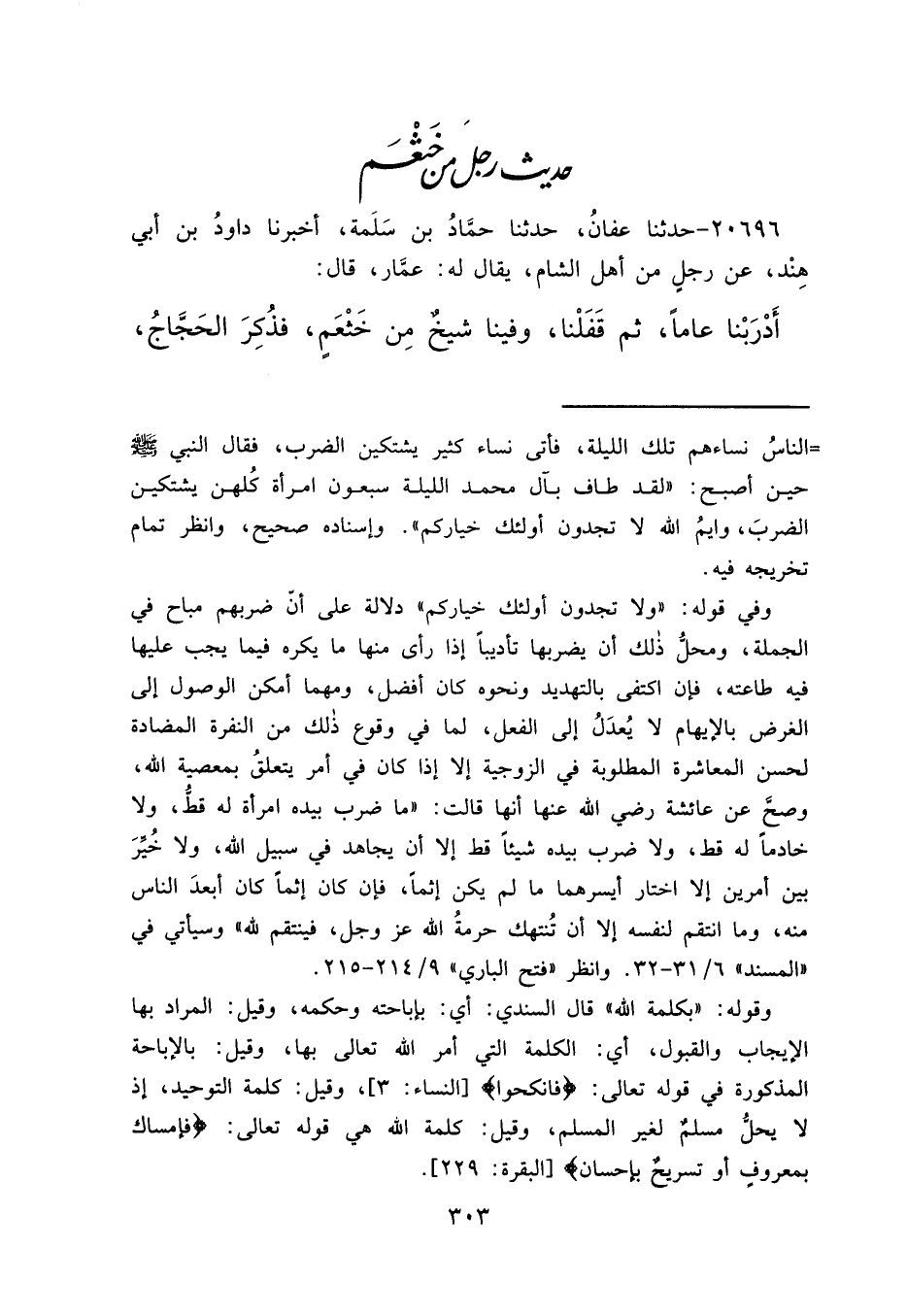 وفي قوله: "ولا تجدون أولئك خياركم" دلالة على أنّ ضربهم مباح في الجملة، ومحلُّ ذلك أن يضربها تأديباً إذا رأى منها ما يكره فيما يجب عليها فيه طاعته، فإن اكتفى بالتهديد ونحوه كان أفضل، ومهما أمكن الوصول إلى الغرض بالإبهام لا يُعدَلُ إلى الفعل، لما في وقوع ذلك من النفرة المضادة لحسن المعاشرة المطلوبة في الزوجية إلا إذا كان في أمر يتعلقُ بمعصية الله، وصحَّ عن عائشة رضي الله عنها أنها قالت: "ما ضرب بيده امرأة له قطُّ، ولا خادماً له قط، ولا ضرب بيده شيئاً قط إلا أن يجاهد في سبيل الله، ولا خُيِّرَ بين أمرين إلا اختار أيسرهما ما لم يكن إثماً، فإن كان إثماً كان أبعدَ الناس منه، وما انتقم لنفسه إلا أن تُنتهك حرمةُ الله عز وجل، فينتقم لله" وسيأتي في