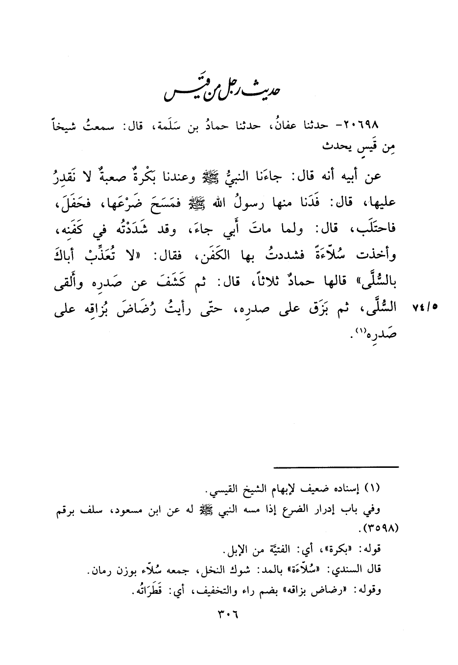 ٢٠٦٩٨ - حَدَّثَنَا عَفَّانُ، حَدَّثَنَا حَمَّادُ بْنُ سَلَمَةَ، قَالَ: سَمِعْتُ شَيْخًا مِنْ قَيْسٍ، يُحَدِّثُ عَنْ أَبِيهِ، أَنَّهُ قَالَ: جَاءَنَا النَّبِيُّ صَلَّى اللهُ عَلَيْهِ وَسَلَّمَ، وَعِنْدَنَا بَكْرَةٌ صَعْبَةٌ، لَا نَقْدِرُ عَلَيْهَا، قَالَ: " فَدَنَا مِنْهَا رَسُولُ اللهِ صَلَّى اللهُ عَلَيْهِ وَسَلَّمَ، فَمَسَحَ ضَرْعَهَا، فَحَفَلَ فَاحْتَلَبَ "