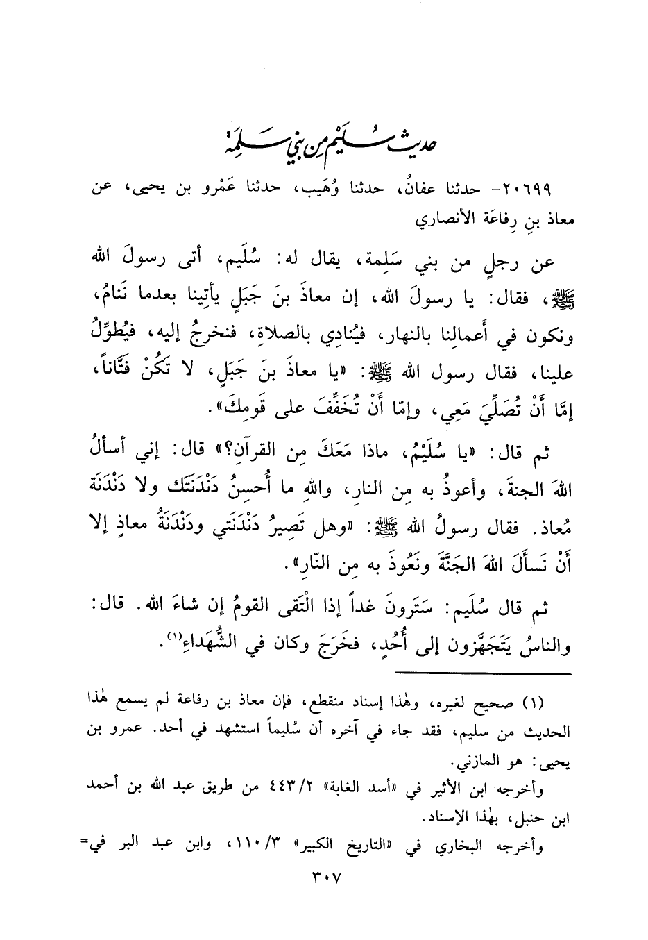٢٠٦٩٩ - حَدَّثَنَا عَفَّانُ، حَدَّثَنَا وُهَيْبٌ، حَدَّثَنَا عَمْرُو بْنُ يَحْيَى، عَنْ مُعَاذِ بْنِ رِفَاعَةَ الْأَنْصَارِيِّ، عَنْ رَجُلٍ مِنْ بَنِي سَلِمَةَ يُقَالُ لَهُ: سُلَيْمٌ، أَتَى رَسُولَ اللهِ صَلَّى اللهُ عَلَيْهِ وَسَلَّمَ، فَقَالَ: يَا رَسُولَ اللهِ، إِنَّ مُعَاذَ بْنَ جَبَلٍ يَأْتِينَا بَعْدَمَا نَنَامُ، وَنَكُونُ فِي أَعْمَالِنَا بِالنَّهَارِ، فَيُنَادِي بِالصَّلَاةِ، فَنَخْرُجُ إِلَيْهِ فَيُطَوِّلُ عَلَيْنَا، فَقَالَ رَسُولُ اللهِ صَلَّى اللهُ عَلَيْهِ وَسَلَّمَ: " يَا مُعَاذُ بْنَ جَبَلٍ، لَا تَكُنْ فَتَّانًا، إِمَّا أَنْ تُصَلِّيَ مَعِي، وَإِمَّا أَنْ تُخَفِّفَ عَلَى قَوْمِكَ "، ثُمَّ قَالَ: " يَا سُلَيْمُ، مَاذَا مَعَكَ مِنَ الْقُرْآنِ؟ " قَالَ: إِنِّي أَسْأَلُ اللهَ الْجَنَّةَ، وَأَعُوذُ بِهِ مِنَ النَّارِ، وَاللهِ مَا أُحْسِنُ دَنْدَنَتَكَ، وَلَا دَنْدَنَةَ مُعَاذٍ، فَقَالَ رَسُولُ اللهِ صَلَّى اللهُ عَلَيْهِ وَسَلَّمَ: " وَهَلْ تَصِيرُ دَنْدَنَتِي، وَدَنْدَنَةُ مُعَاذٍ إِلَّا أَنْ نَسْأَلَ اللهَ الْجَنَّةَ، وَنَعُوذَ بِهِ مِنَ النَّارِ "، ثُمَّ قَالَ سُلَيْمٌ: " سَتَرَوْنَ غَدًا إِذَا الْتَقَى الْقَوْمُ إِنْ شَاءَ اللهُ "، قَالَ: وَالنَّاسُ يَتَجَهَّزُونَ إِلَى أُحُدٍ، فَخَرَجَ وَكَانَ فِي الشُّهَدَاءِ (١)