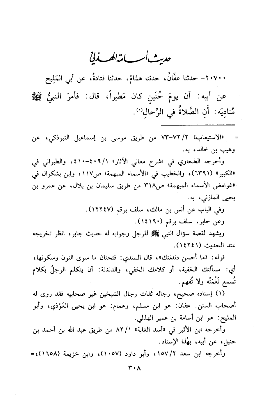 ٢٠٧٠٠ - حَدَّثَنَا عَفَّانُ، حَدَّثَنَا هَمَّامٌ، حَدَّثَنَا قَتَادَةُ، عَنْ أَبِي الْمَلِيحِ، عَنْ أَبِيهِ، أَنَّ يَوْمَ حُنَيْنٍ كَانَ مَطِيرًا، قَالَ: " فَأَمَرَ النَّبِيُّ صَلَّى اللهُ عَلَيْهِ وَسَلَّمَ مُنَادِيَهُ: أَنَّ الصَّلَاةَ فِي الرِّحَالِ ". (١)