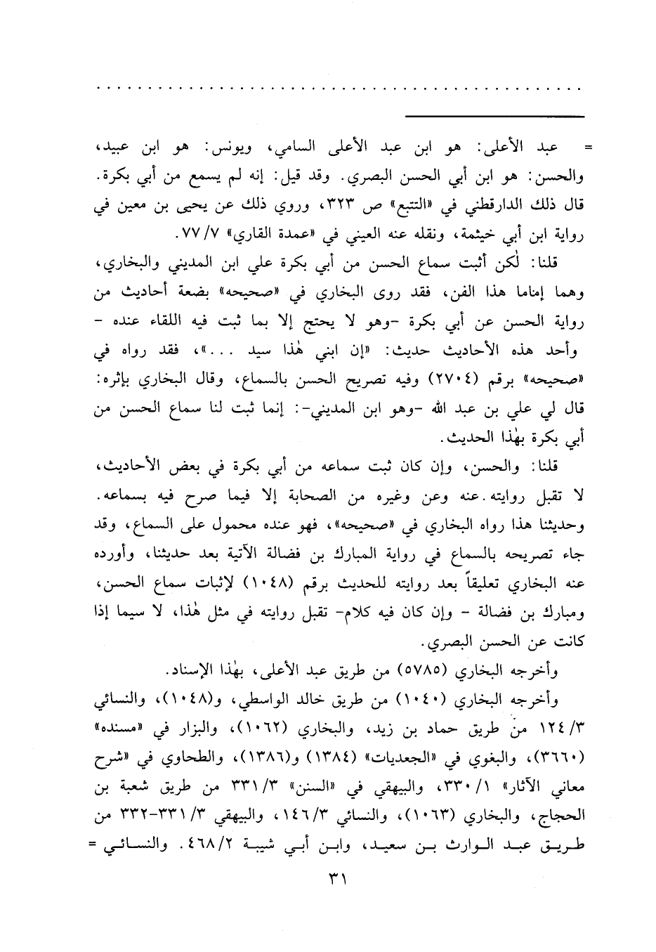 قلنا: لكن أثبت سماع الحسن من أبي بكرة علي ابن المديني والبخاري، وهما إماما هذا الفن، فقد روى البخاري في "صحيحه" بضعة أحاديث من رواية الحسن عن أبي بكرة- وهو لا يحتج إلا بما ثبت فيه اللقاء عنده- وأحد هذه الأحاديث حديث: "إن ابني هذا سيد ... "، فقد رواه في "صحيحه" برقم (٢٧٠٤) وفيه تصريح الحسن بالسماع، وقال البخاري بإثره: قال لي علي بن عبد الله- وهو ابن المديني-: إنما ثبت لنا سماع الحسن من أبي بكرة بهذا الحديث.