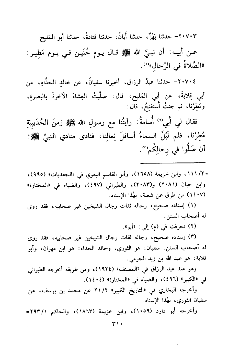 ٢٠٧٠٤ - حَدَّثَنَا عَبْدُ الرَّزَّاقِ، أَخْبَرَنَا سُفْيَانُ، عَنْ خَالِدٍ الْحَذَّاءِ، عَنْ أَبِي قِلَابَةَ، عَنْ أَبِي الْمَلِيحِ، قَالَ: صَلَّيْتُ الْعِشَاءَ الْآخِرَةَ بِالْبَصْرَةِ، وَمُطِرْنَا، ثُمَّ جِئْتُ أَسْتَفْتِحُ، قَالَ: فَقَالَ لِي أَبي (٢) أُسَامَةُ: رَأَيْتُنَا مَعَ رَسُولِ اللهِ صَلَّى اللهُ عَلَيْهِ وَسَلَّمَ زَمَنَ الْحُدَيْبِيَةِ مُطِرْنَا، فَلَمْ تَبُلَّ السَّمَاءُ أَسَافِلَ نِعَالِنَا، فَنَادَى مُنَادِي النَّبِيِّ صَلَّى اللهُ عَلَيْهِ وَسَلَّمَ: " أَنْ صَلُّوا فِي رِحَالِكُمْ " (٣)