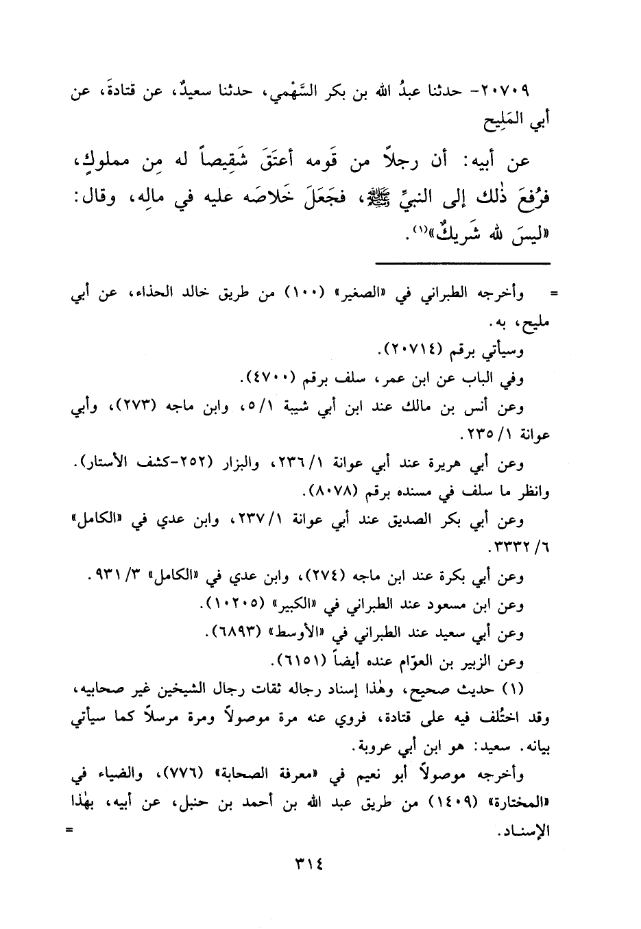 ٢٠٧٠٩ - حَدَّثَنَا عَبْدُ اللهِ بْنُ بَكْرٍ السَّهْمِيُّ، حَدَّثَنَا سَعِيدٌ، عَنْ قَتَادَةَ، عَنْ أَبِي الْمَلِيحِ، عَنْ أَبِيهِ، أَنَّ رَجُلًا مِنْ قَوْمِهِ أَعْتَقَ شَقِيصًا لَهُ مِنْ مَمْلُوكٍ، فَرَفَعَ ذَلِكَ إِلَى النَّبِيِّ صَلَّى اللهُ عَلَيْهِ وَسَلَّمَ، فَجَعَلَ خَلَاصَهُ عَلَيْهِ فِي مَالِهِ، وَقَالَ: " لَيْسَ لِلَّهِ شَرِيكٌ ". (١)