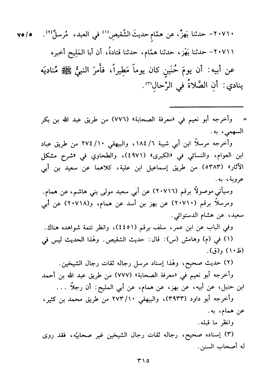 ٢٠٧١١ - حَدَّثَنَا بَهْزٌ، حَدَّثَنَا هَمَّامٌ، حَدَّثَنَا قَتَادَةُ، أَنَّ أَبَا الْمَلِيحِ، أَخْبَرَهُ عَنْ أَبِيهِ، أَنَّ يَوْمَ حُنَيْنٍ كَانَ يَوْمًا مَطِيرًا، " فَأَمَرَ النَّبِيُّ صَلَّى اللهُ عَلَيْهِ وَسَلَّمَ مُنَادِيَهُ يُنَادِي: أَنَّ الصَّلَاةَ فِي الرِّحَالِ " (٣)