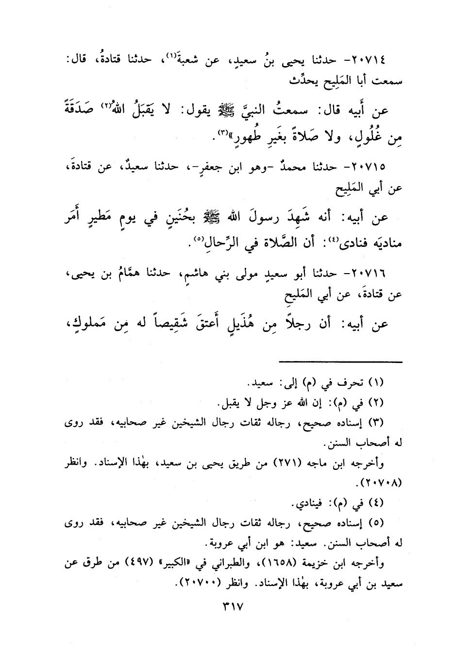 ٢٠٧١٤ - حَدَّثَنَا يَحْيَى بْنُ سَعِيدٍ، عَنْ شُعْبَةَ، (١) حَدَّثَنَا قَتَادَةُ، قَالَ: سَمِعْتُ أَبَا الْمَلِيحِ، يُحَدِّثُ عَنْ أَبِيهِ، قَالَ: سَمِعْتُ النَّبِيَّ صَلَّى اللهُ عَلَيْهِ وَسَلَّمَ يَقُولُ: " لَا يَقْبَلُ اللهُ (٢) صَدَقَةً مِنْ غُلُولٍ، وَلَا صَلَاةً بِغَيْرِ طُهُورٍ " (٣)