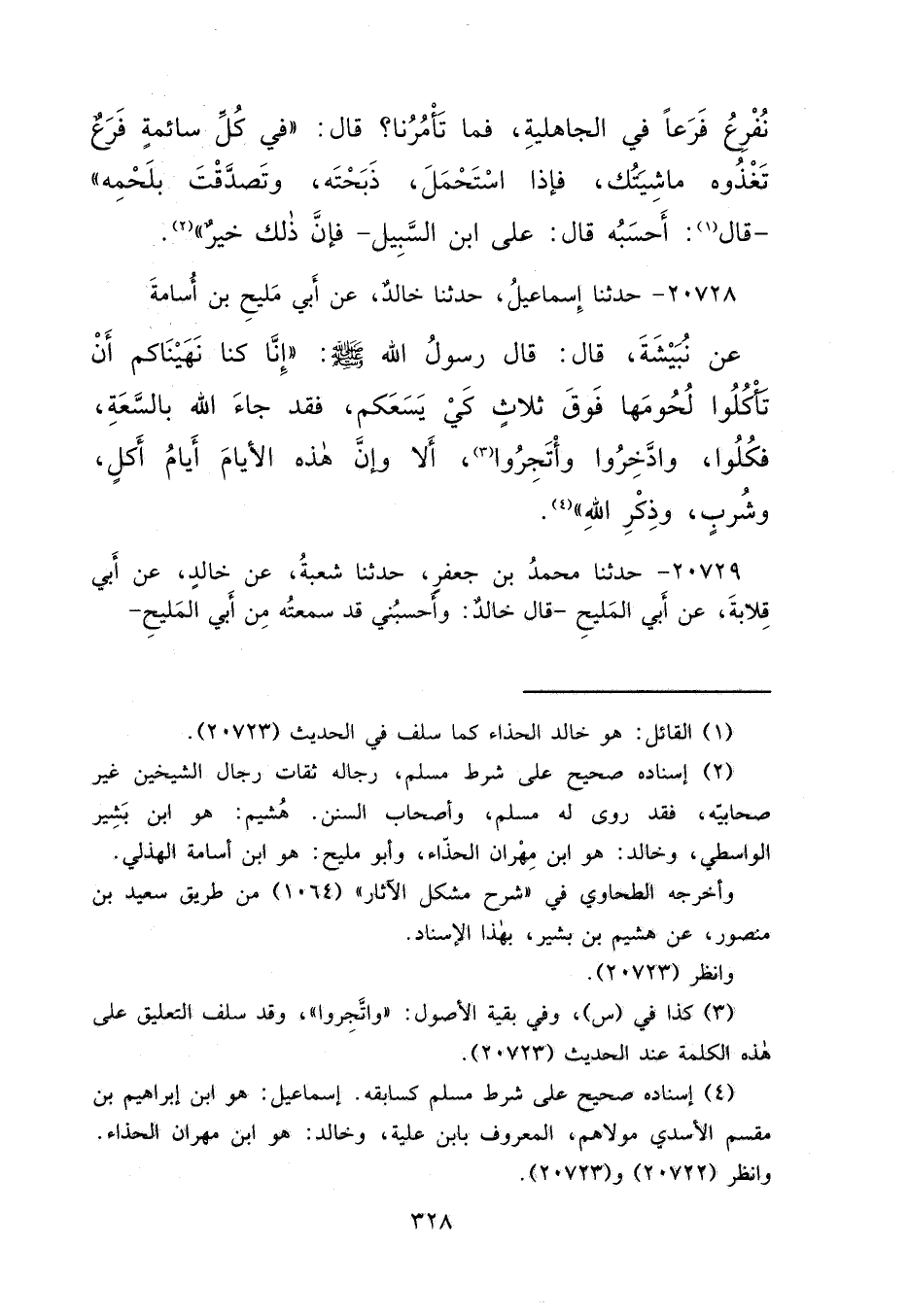 (٢) إسناده صحيح على شرط مسلم، رجاله ثقات رجال الشيخين غير صحابيّه، فقد روى له مسلم، وأصحاب السنن. هُشيم: هو ابن بَشِير الواسطي، وخالد: هو ابن مِهْران الحذاء، وأبو مليح: هو ابن أسامة الهذلي.