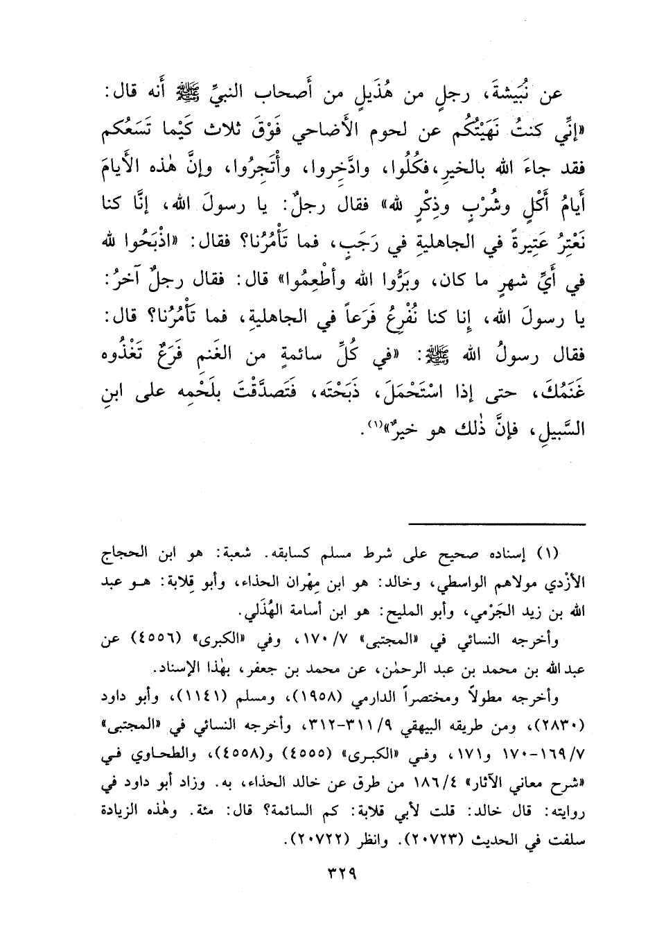 فَقَالَ رَجُلٌ: يَا رَسُولَ اللهِ، إِنَّا كُنَّا نَعْتِرُ عَتِيرَةً فِي الْجَاهِلِيَّةِ فِي رَجَبٍ، فَمَا تَأْمُرُنَا؟ فَقَالَ: " اذْبَحُوا لِلَّهِ فِي أَيِّ شَهْرٍ مَا كَانَ، وَبَرُّوا اللهَ وَأَطْعِمُوا "، فَقَالَ رَجُلٌ آخَرُ: يَا رَسُولَ اللهِ، إِنَّا كُنَّا نُفَرِّعُ فَرَعًا فِي الْجَاهِلِيَّةِ، فَمَا تَأْمُرُنَا؟ قَالَ: فَقَالَ رَسُولُ اللهِ صَلَّى اللهُ عَلَيْهِ وَسَلَّمَ: " فِي كُلِّ سَائِمَةٍ مِنَ الْغَنَمِ فَرَعٌ، تَغْذُوهُ غَنَمُكَ، حَتَّى إِذَا اسْتَحْمَلَ ذَبَحْتَهُ، فَتَصَدَّقْتَ بِلَحْمِهِ، عَلَى ابْنِ السَّبِيلِ، فَإِنَّ ذَلِكَ هُوَ خَيْرٌ " (١)