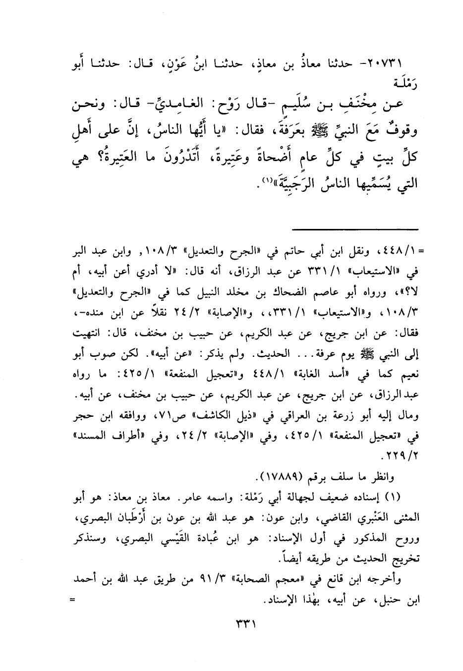 ٢٠٧٣١ - حَدَّثَنَا مُعَاذُ بْنُ مُعَاذٍ، حَدَّثَنَا ابْنُ عَوْنٍ، قَالَ: حَدَّثَنَا أَبُو رَمْلَةَ، عَنْ مِخْنَفِ بْنِ سُلَيْمٍ، قَالَ رَوْحٌ: الْغَامِدِيُّ، قَالَ: وَنَحْنُ وُقُوفٌ مَعَ النَّبِيِّ صَلَّى اللهُ عَلَيْهِ وَسَلَّمَ بِعَرَفَةَ، فَقَالَ: " يَا أَيُّهَا النَّاسُ، إِنَّ عَلَى أَهْلِ كُلِّ بَيْتٍ فِي كُلِّ عَامٍ أَضْحَاةً، وَعَتِيرَةً، أَتَدْرُونَ مَا الْعَتِيرَةُ؟ هِيَ الَّتِي يُسَمِّيهَا النَّاسُ الرَّجَبِيَّةُ " (١)